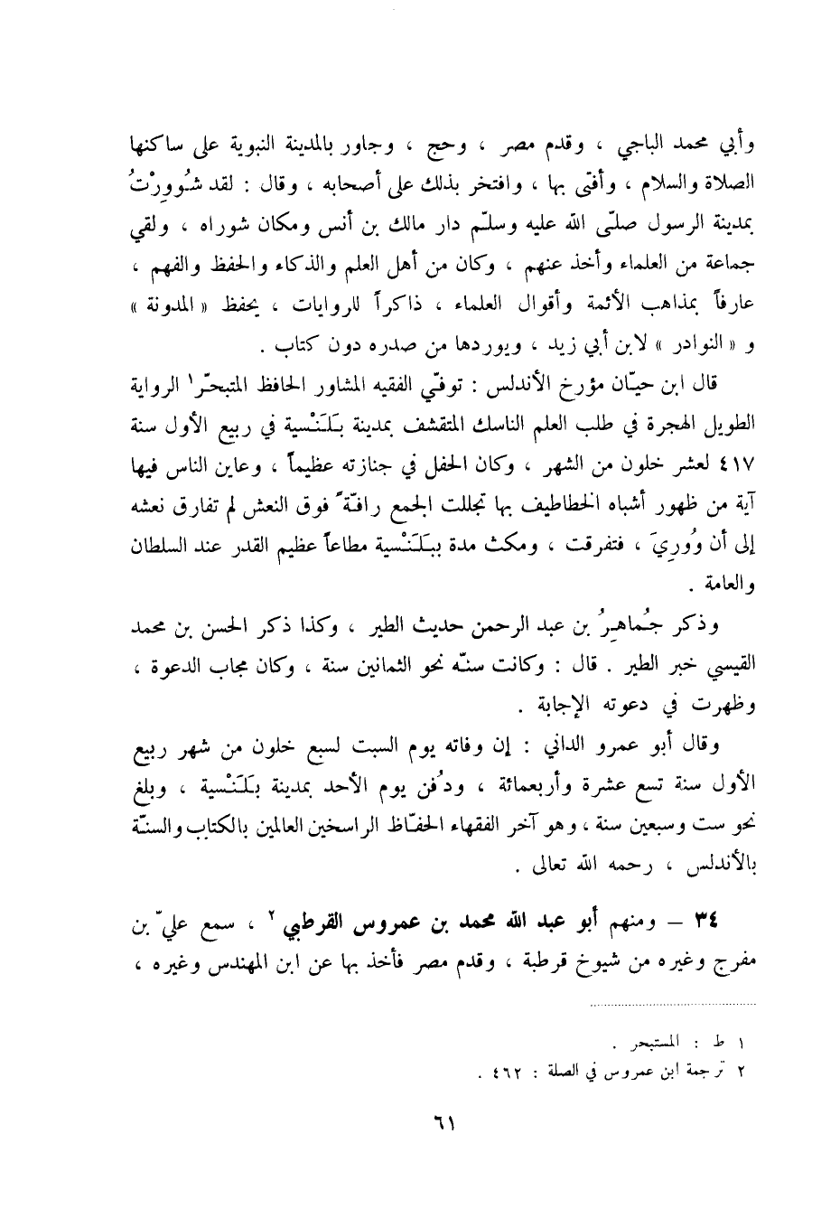 34 - ومنهم أبو عبد الله محمد بن عمروس القرطبي (2) ، سمع عليّ بن مفرج وغيره من شيوخ قرطبة، وقدم مصر فأخذ بها عن ابن المهندس وغيره،