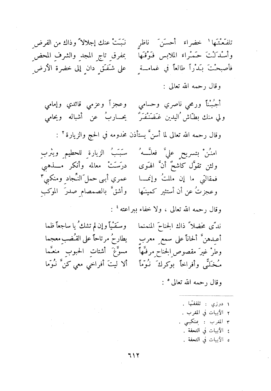 تلفّعتها (1) خضراء أحسن ناظرٍ ... نبت عنك إجلالاً وذاك من الفرض وأسدلت حمراء الملابس فوقها بمفرق تاج المجد والشرف المحض