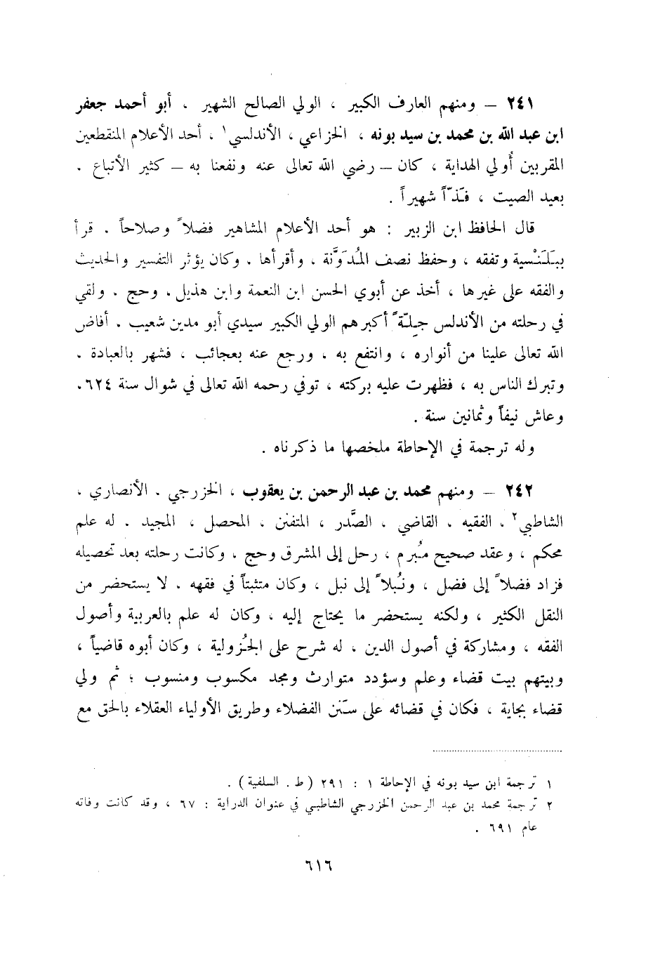 241 - ومنهم العارف الكبير، الولي الصالح الشهير، أبو أحمد جعفر ابن عبد الله بن محمد بن سيد بونه، الخزاعي، الأندلسي (1) ، أحد الأعلام المنقطعين القربين أولي الهداية، كان - رضي الله تعالى عنه ونفعنا به - كثير الأتباع، بعيد الصيت، فذّاً شهيراً.