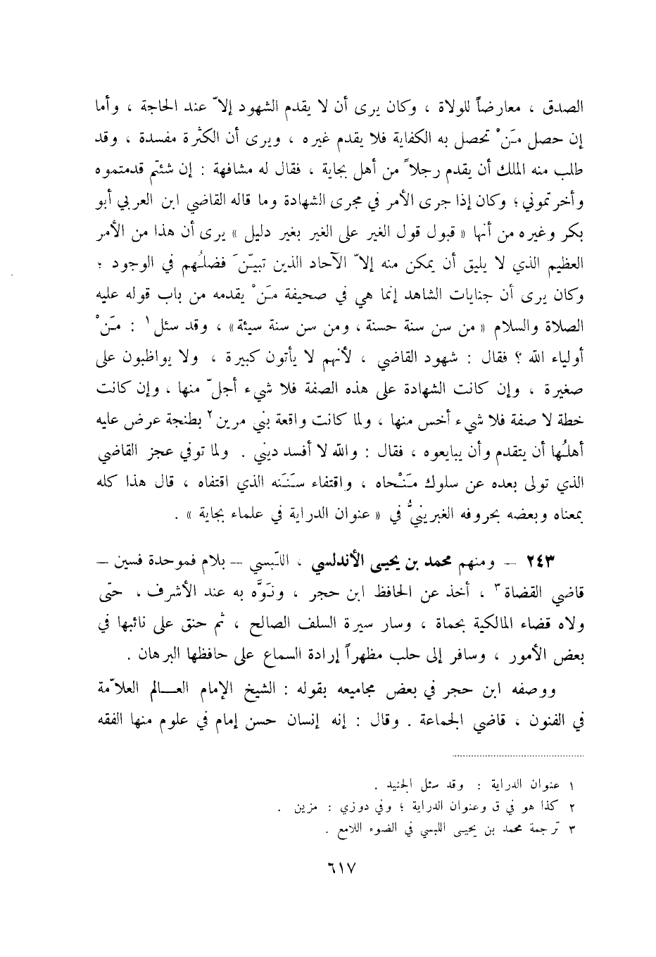 243 - ومنهم محمد بن يحيى الأندلسي، اللّبسي - بلام فموحدة فسين - قاضي القضاة (3) ، أخذ عن الحافظ ابن حجر، ونوّه به عند الأشرف، حتى ولاه قضاء المالكية بحماة، وسار سيرة السلف الصالح، ثم حنق على نائبها في بعض الأمور، وسافر إلى حلب مظهراً إرادة السماع على حافظها البرهان.