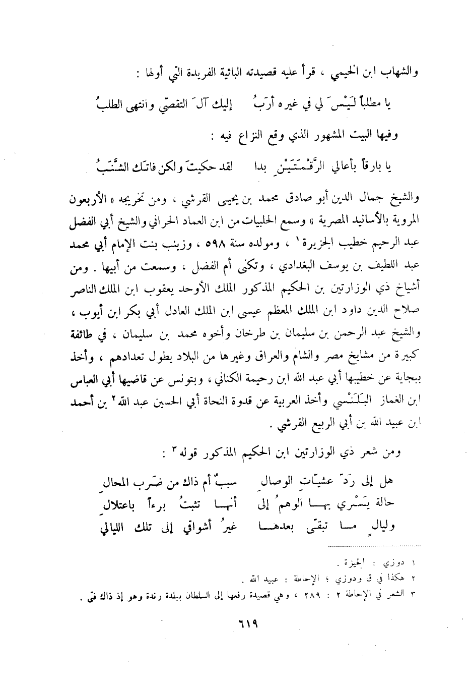 والشيخ جمال الدين أبو صادق محمد بن يحيى القرشي، ومن تخريجه الأربعون المروية بالأسانيد المصرية وسمع الحلبيات من ابن العماد الحراني والشيخ أبي الفضل عبد الرحيم خطيب الجزيرة (1) ، ومولده سنة 598، وزينب بنت الإمام أبي محمد عبد اللطيف بن يوسف البغدادي، وتكنى أم الفضل، وسمعت من أبيها. ومن أشياخ ذي الوزارتين بن الحكيم المذكور الملك الأوحد يعقوب ابن الملك الناصر صلاح الدين داود ابن الملك المعظم عيسى ابن الملك العادل أبي بكر ابن أيوب، والشيخ عبد الرحمن بن سليمان بن طرخان وأخوه محمد بن سليمان، في طائفة كبيرة من مشايخ مصر والشام والعراق وغيرها من البلاد يطول تعدادهم، وأخذ ببجاية عن خطيبها أبي عبد الله ابن رحيمة الكناني، وبتونس عن قاضيها أبي العباس ابن الغماز البلنسي وأخذ العربية عن قدوة النحاة أبي الحسين عبد الله (2) بن أحمد ابن عبيد الله بن أبي الربيع القرشي.