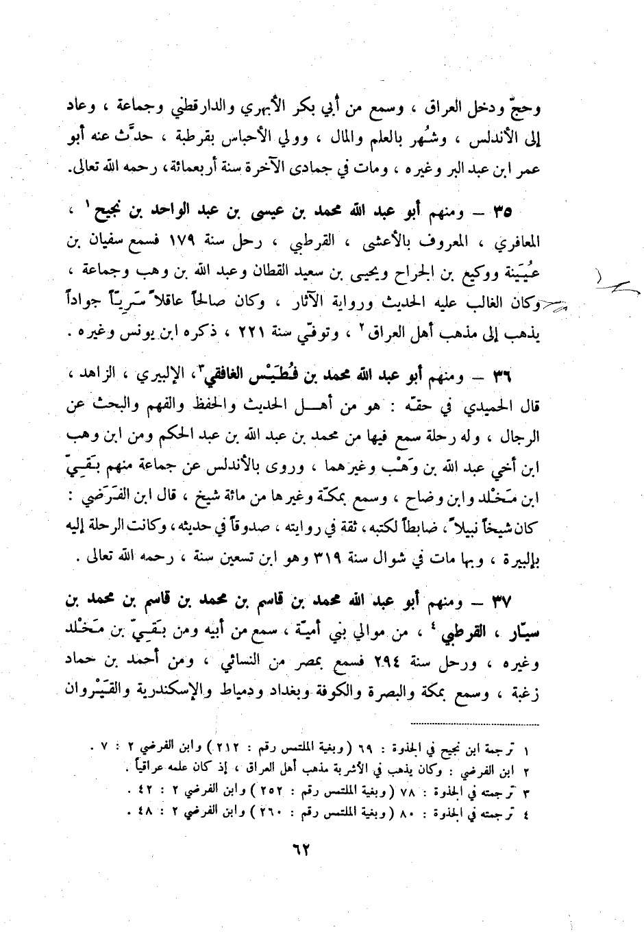 36 - ومنهم أبو عبد الله محمد بن فطيس الغافقي (3) ، الإلبيري، الزاهد، قال الحميدي في حقّه: هو من أهل الحديث والحفظ والفهم والبحث عن الرجال، وله رحلة سمع فيها من محمد بن عبد الله بن عبد الحكم ومن ابن وهب ابن أخي عبد الله بن وهب وغيرهما، وروى بالأندلس عن جماعة منهم بقيّ ابن مخلد وابن وضاح، وسمع بمكّة وغيرها من مائة شيخ، قال ابن الفرضي: كان شيخاً نبيلاً، ضابطاً لكتبه، ثقة في روايته، صدوقاً في حديثه، وكانت الرحلة إليه بإلبيرة، وبها مات في شوال سنة 319 وهو ابن تسعين سنة، رحمه الله تعالى.