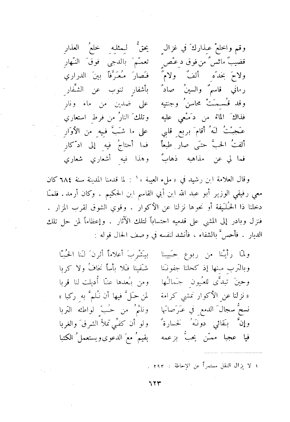 وقال العلامة ابن رشيد في " ملء العيبة " (1) : لما قدمنا المدينة سنة 684 كان معي رفيقي الوزير أبو عبد الله ابن أبي القاسم ابن الحكيم، وكان أرمد، فلمّا دخلنا ذا الحليفة أو نحوها نزلنا عن الكوار، وقوي الشوق لقرب المزار، فنزل وبادر إلى المشي على قدميه احتساباً لتلك الآثار، وإعظاماً لمن حل تلك الديار، فأحسّ بالشفاء، فأنشد لنفسه في وصف الحال قوله: