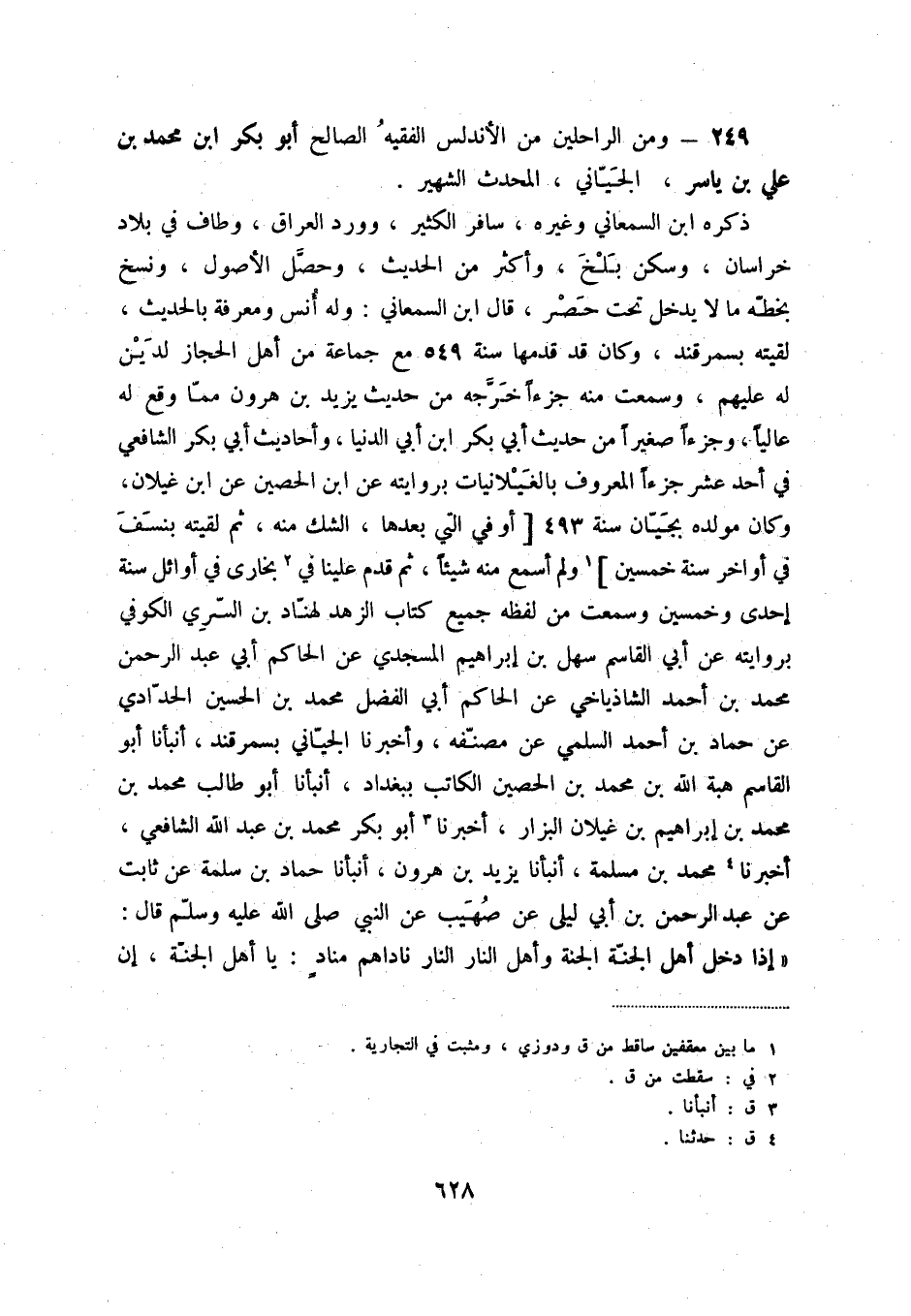 249 - ومن الراحلين من الأندلس الفقيه الصالح أبو بكر ابن محمد بن علي بن ياسر، الجيّاني، المحدث الشهير.