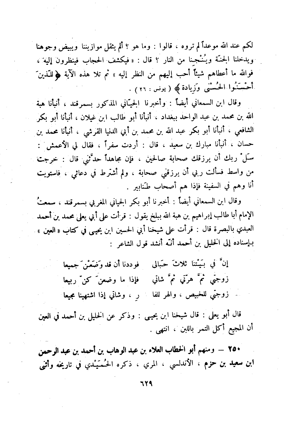 وقال ابن السمعاني أيضاً: أخبرنا أبو بكر الجياني المغربي بسمرقند، سمعت الإمام أبا طالب إبراهيم بن هبة الله ببلخ يقول: قرأت على أبي يعلى محمد بن أحمد العبدي بالبصرة قال: قرأت على شيخنا أبي الحسين ابن يحيى في كتاب العين بإسناده إلى الخليل بن أحمد أنّه أنشد قول الشاعر: