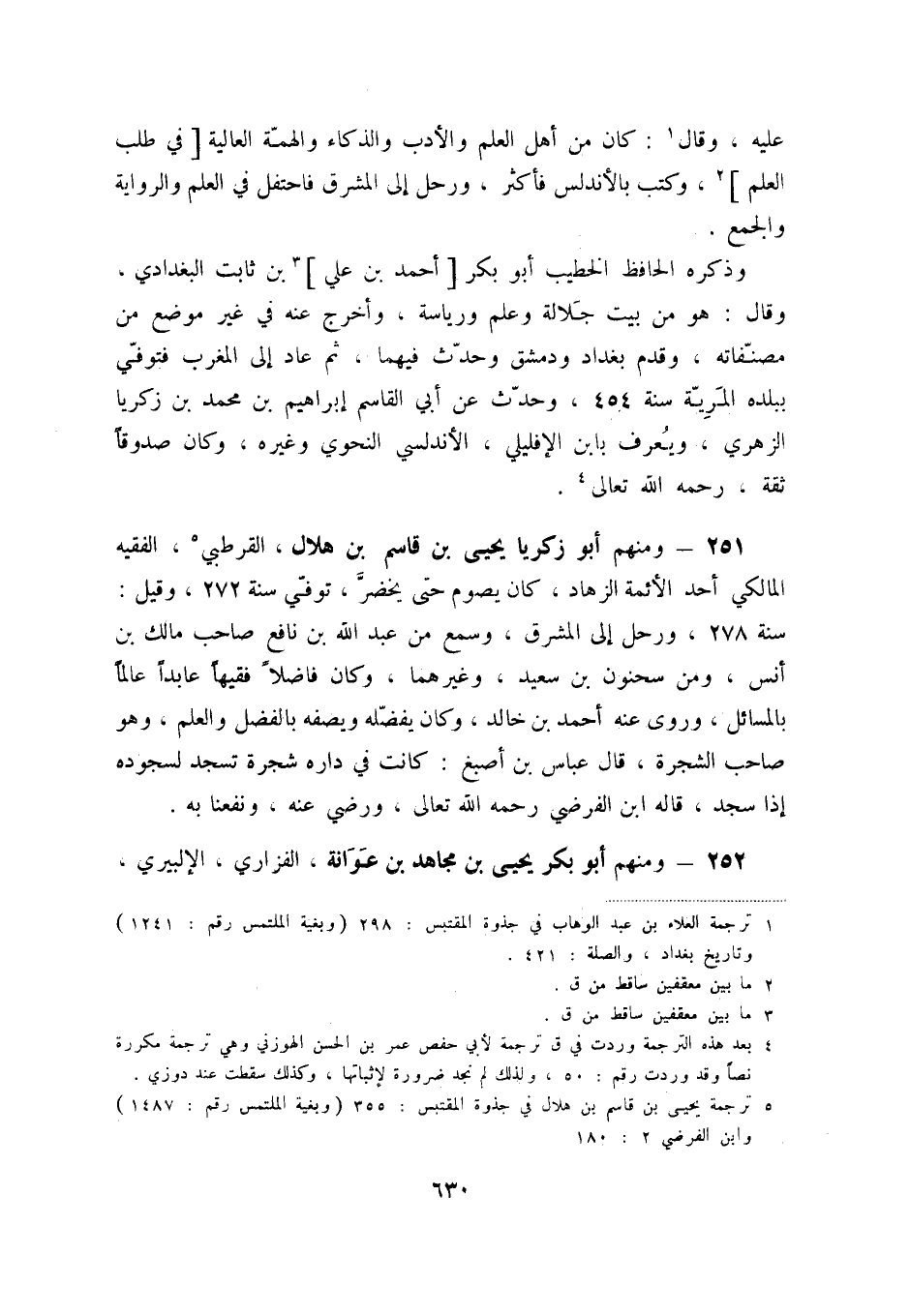 251 - ومنهم أبو زكريا يحيى بن قاسم القرطبي (5) ، الفقيه المالكي أحد الأئمة الزهاد، كان يصوم حتى يخضرّ، توفّي سنة 272، وقيل: سنة 278، ورحل إلى المشرق، وسمع من عبد الله بن نافع صاحب مالك بن أنس، ومن سحنون بن سعيد، وغيرهما، وكان يفضّله ويصفه بالفضل والعلم، وهو صاحب الشجرة، قال عباس بن أصبغ: كانت في داره شجرة تسجد لسجوده إذا سجد، قاله ابن الفرضي، رحمه الله تعالى، ورضي عنه، ونفعنا به.