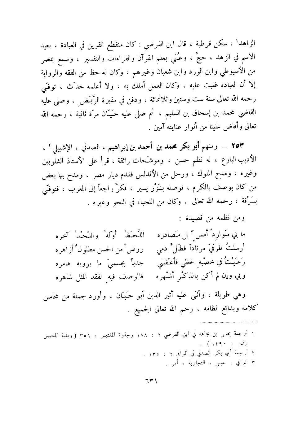 253 - ومنهم أبو بكر محمد بن أحمد بن إبراهيم، الصدفي، الإشبيلي (2) ، الأديب البارع، له نظم حسن، وموشّحات رائقة، قرأ على الأستاذ الشلوبين وغيره، ومدح الملوك، ورحل من الأندلس فقدم ديار مصر، ومدح بها بعض من كان يوصف بالكرم، فوصله بنزر يسير، فكرّ راجعاً إلى المغرب، فتوفّي ببرقة، رحمه الله تعالى، وكان من النجباء في النحو وغيره.