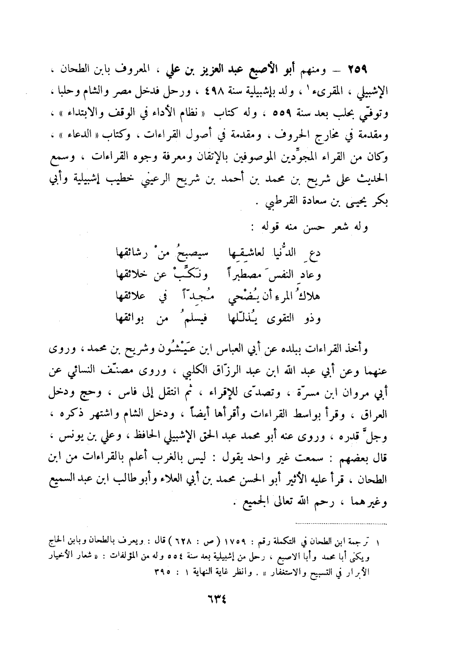259 - ومنهم أبو الأصبع عبد العزيز بن علي، المعروف بابن الطحان، الإشبيلي المقرئ (1) ، ولد بإشبيلية سنة 498، ورحل فدخل مصر والشام وحلبا، توفّي بحلب بعد سنة 559، وله كتاب نظام الأداء في الوقف والابتداء، ومقدمة في مخارج الحروف، ومقدمة في أصول القراءات، وكتاب الدعاء، وكان من القراء المجوّدين الموصوفين بالإتقان ومعرفة وجوه القراءات، وسمع الحديث على شريح بن محمد بن أحمد بن شريح الرعيني خطيب إشبيلية وأبي بكر يحيى بن سعادة القرطبي.