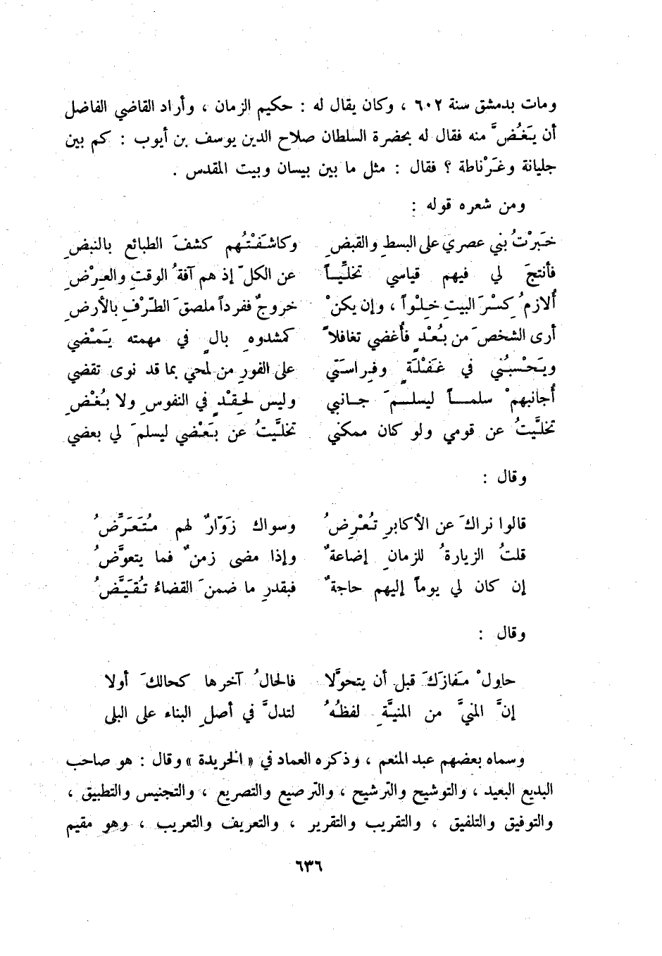 وسماه بعضهم عبد المنعم، وذكره العماد في الخريدة وقال: هو صاحب البديع البعيد، والتوشيح والترشيح، والترصيع والتصريع، والتجنيس والتطبيق، والتوفيق والتلفيق، والتقريب والتقرير، والتعريف والتعريب، وهو مقيم