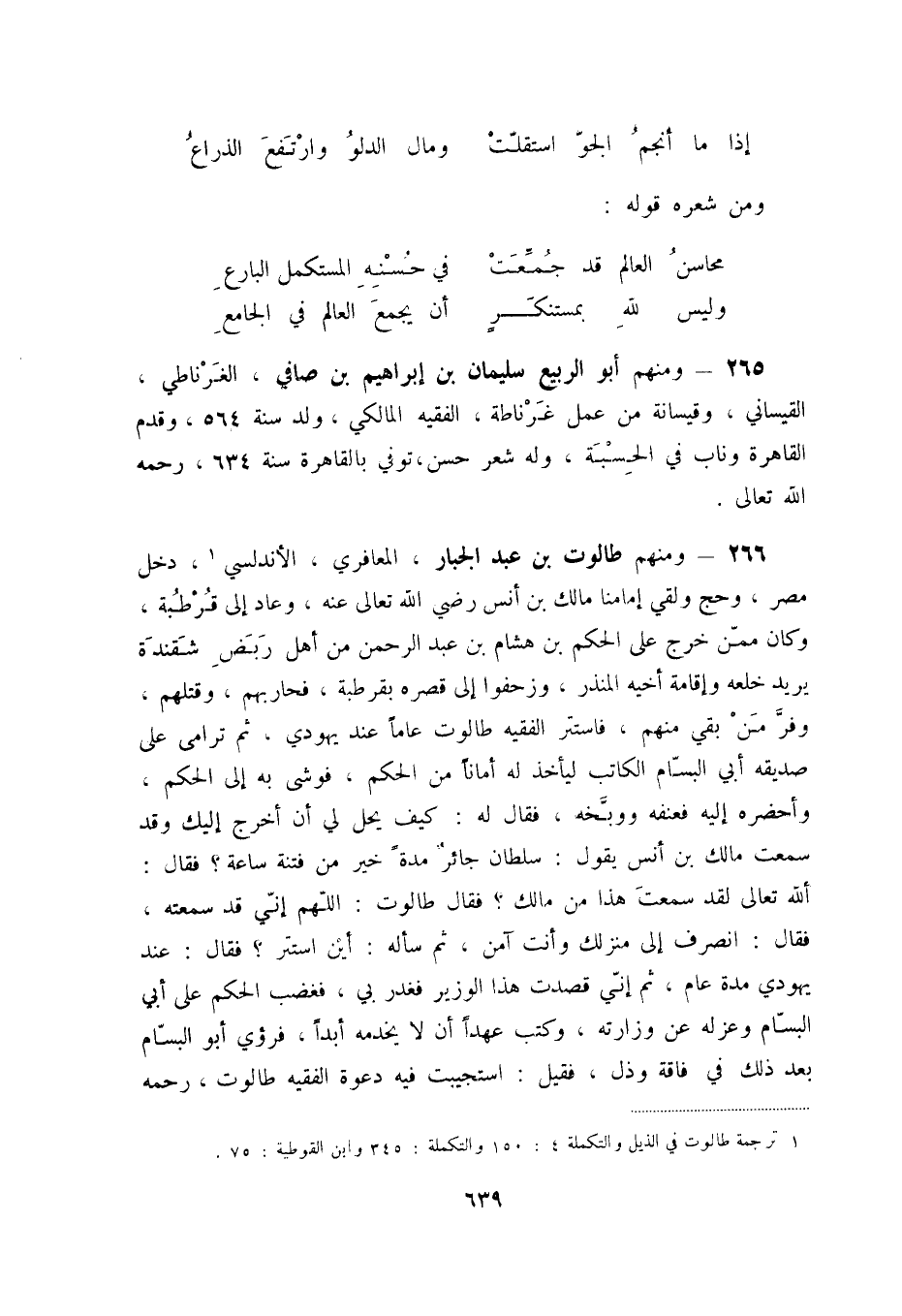 265 - ومنهم أبو الربيع سليمان بن إبراهيم بن صافي، الغرناطي، القيساني، وقيسانة من عمل غرناطة، الفقيه المالكي، ولد سنة 564، وقدم القاهرة وناب في الحسبة، وله شعر حسن، توفي بالقاهرة سنة 634، رحمه الله تعالى.