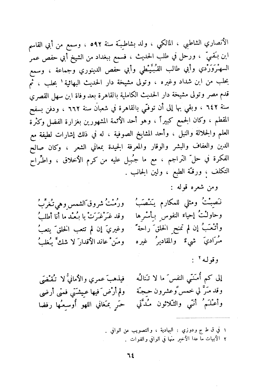 الأنصاري الشاطبي، المالكي، ولد بشاطبة سنة 592، وسمع من أبي القاسم ابن بقيّ، ورحل في طلب الحديث، فسمع ببغداد من الشيخ أبي حفص عمر السهروردي وأبي طالب القبّيطي وأبي حفص الدينوري وجماعة، وسمع بحلب من ابن شداد وغيره، وتولى مشيخة دار الحديث البهائية (1) بحلب، ثم قدم مصر وتولى مشيخة دار الحديث الكاملية بالقاهرة بعد وفاة ابن سهل اقصري سنة 642، وبقي بها إلى أن توفّي بالقاهرة في شعبان سنة 662، ودفن بسفح المقطم وكان الجمع كبيراً، وهو أحد الأئمة المشهورين بغزارة الفضل وكثرة العلم والجلالة والنبل، وأحد المشايخ الصوفية، له في ذلك إشارات لطيفة مع الدين والعفاف والبشر والوقار والمعرفة الجيدة بمعاني الشعر، وكان صالح الفكرة في حلّ التراجم، مع ما جبل عليه من كرم الأخلاق، واطّراح التكلف، ورقّة الطبع، ولين الجانب.