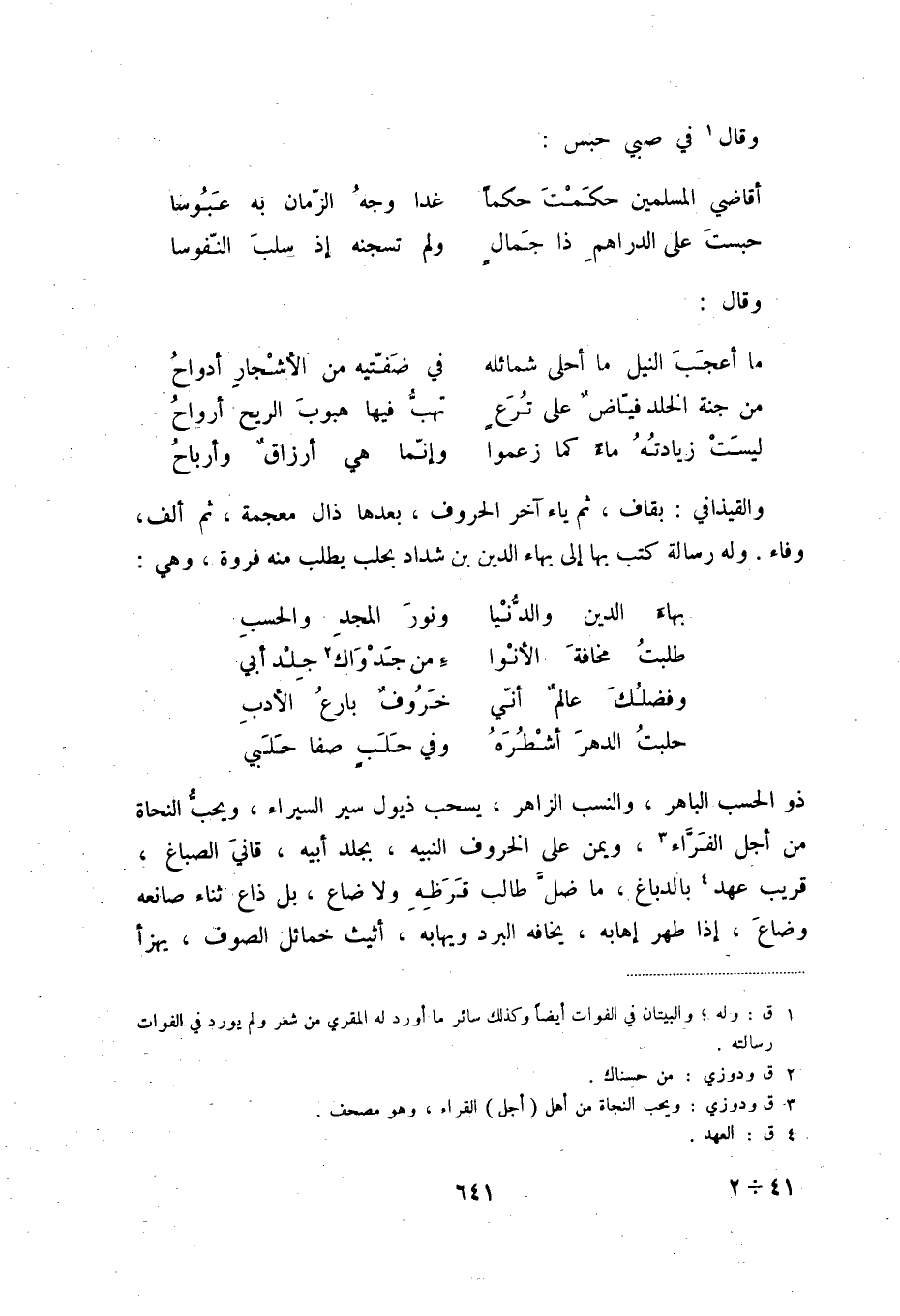 ذو الحسب الباهر، والنسب الزاهر، يسحب ذيول سير السيراء، ويحبّ النحاة من أجل الفرّاء (3) ، ويمن على الخروف النبيه، بجلد أبيه، قاني الصباغ، قريب عهد (4) بالدباغ، ما ضلّ طالب قرظه ولا ضاع، بل ذاع ثناء صانعه وضاع، إذا طهر إهابه، يخافه البرد ويهابه، أثيث خمائل الصوف، يهزأ