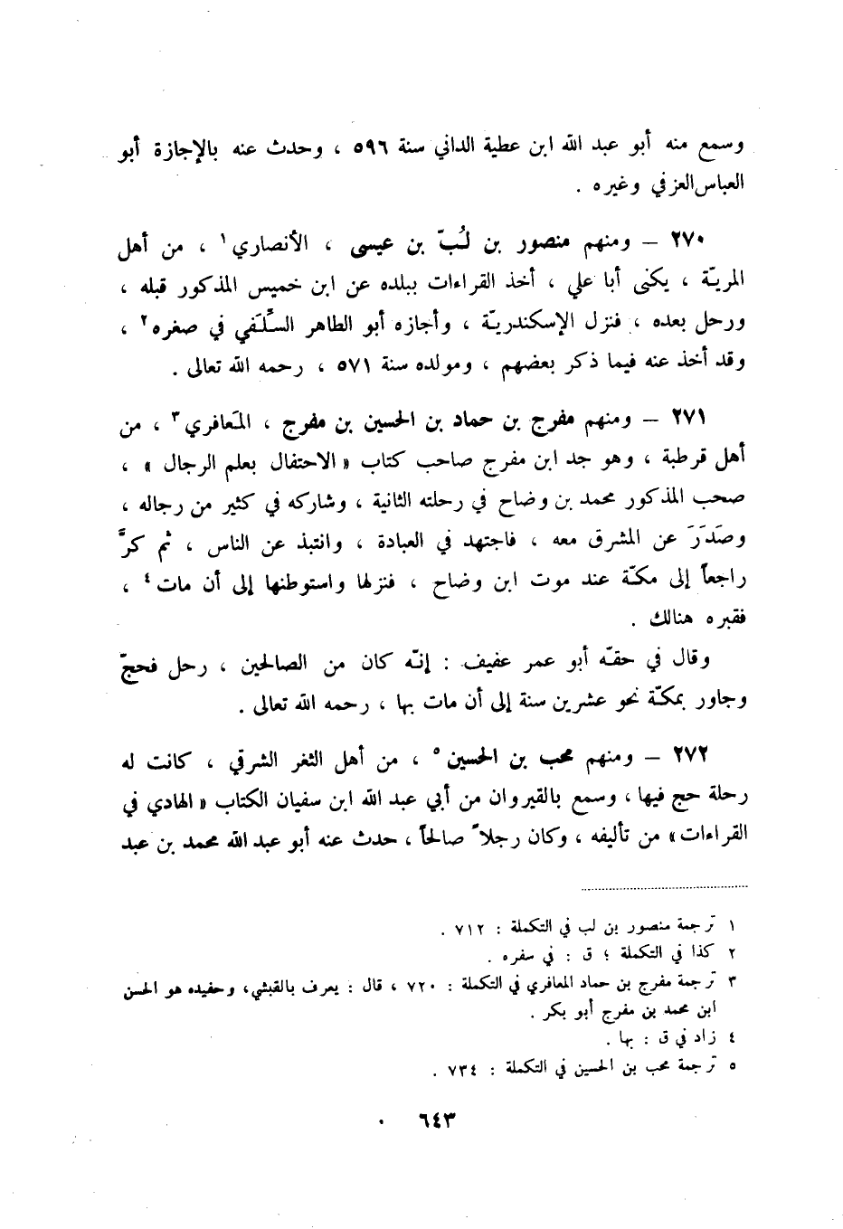 271 - ومنهم مفرج بن حماد بن الحسين بن مفرج، المعافري (3) ، من أهل قرطبة، وهو جد ابن مفرج صاحب كتاب الاحتفال بعلم الرجال، صحب المذكور محمد بن وضاح في رحلته الثانية، وشاركه في كثير من رجاله، وصدر عن المشرق معه، فاجتهد في العبادة، وانتبذ عن الناس، ثم كرّ راجعاً إلى مكّة عند موت ابن وضاح، فنزلها واستوطنها إلى أن مات (4) ، فقبره هنالك.