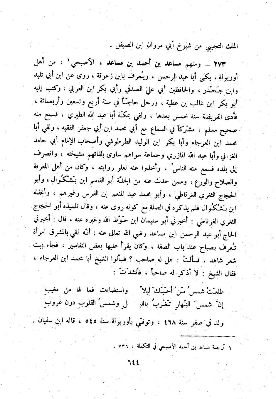 273 - ومنهم مساعد بن أحمد بن مساعد، الأصبحي (1) ، من أهل أوريولة، يكنى أبا عبد الرحمن، ويعرف بابن زعوقة، روى عن ابن أبي تليد وابن جحدر، والحافظين أبي علي الصدفي وأبي بكر ابن العربي، وكتب إليه أبو بكر ابن غالب بن عطية، ورحل حاجّاً في سنة أربع وتسعين وأربعمائة، فأدى الفريضة سنة خمس بعدها، ولقي بمكّة أبا عبد الله الطبري، فسمع منه صحيح مسلم، مشتركاً في السماع مع أبي محمد ابن أبي جعفر الفقيه، ولقي أبا محمد ابن العرجاء وأبي بكر ابن الوليد الطرطوشي وأصحاب الإمام أبي حامد الغزالي وأبا عبد الله المازري وجماعة سواهم ساوى بلقائهم مشيخته، وانصرف إلى بلده فسمع منه الناس، وأخذوا عنه لعلو روايته، وكان من أهل المعرفة والصلاح والورع، وممن حدث عنه من الجلّة أبو القاسم ابن بشكوال، وأبو الحجاج الثغري الغرناطي، وأبو محمد عبد المنعم بن الفرس وغيرهم، وأغفله ابن بشكوال فلم يذكره في الصلة مع كونه روى عنه، وقال تلميذه أبو الحجاج الثغري الغرناطي: أخبرني أبو سليمان ابن حوط الله وغيره عنه، قال: أخبرني الحاج أبو عبد الرحمن ابن مساعد رضي الله تعالى عنه: أنّه لقي بالمشرق امرأة تعرف بصباح عند باب الصفا، وكان يقرأ عليها بعض التفاسير، فجاء بيت شعر شاهد، فسألت: هل له صاحب فسألوا الشيخ أبا محمد ابن العرجاء، فقال الشيخ: لا أذكر له صاحباً، فأنشدت:
