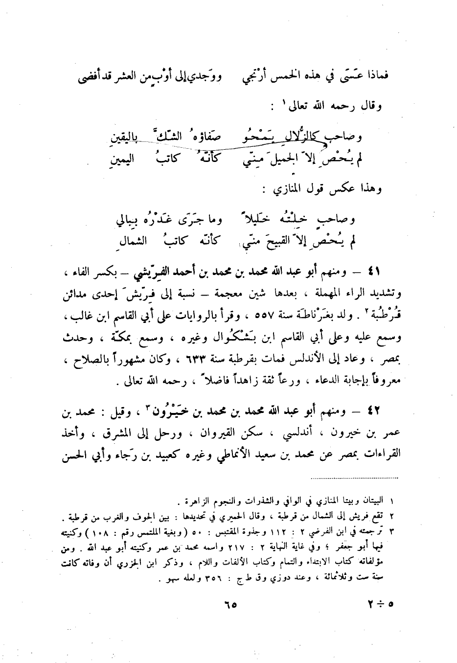 لم يحص إلاّ القبيح منّي ... كأنّه كاتب الشمال 41 - ومنهم أبو عبد الله محمد بن محمد بن أحمد الفرّيشي - بكسر الفاء، وتشديد الراء المهملة، بعدها شين معجمة - نسبة إلى فرّيش إحدى مدائن قرطبة (2) . ولد بغرناطة سنة 557، وقرأ بالروايات على أبي القاسم ابن غالب، وسمع عليه وعلى أبي القاسم ابن بشكوال وغيره، وسمع بمكّة، وحدث بمصر، وعاد إلى الأندلس فمات بقرطبة سنة 633، وكان مشهوراً بالصلاح معروفاً بإجابة الدعاء، ورعاً ثقة زاهداً فاضلاً، رحمه الله تعالى.