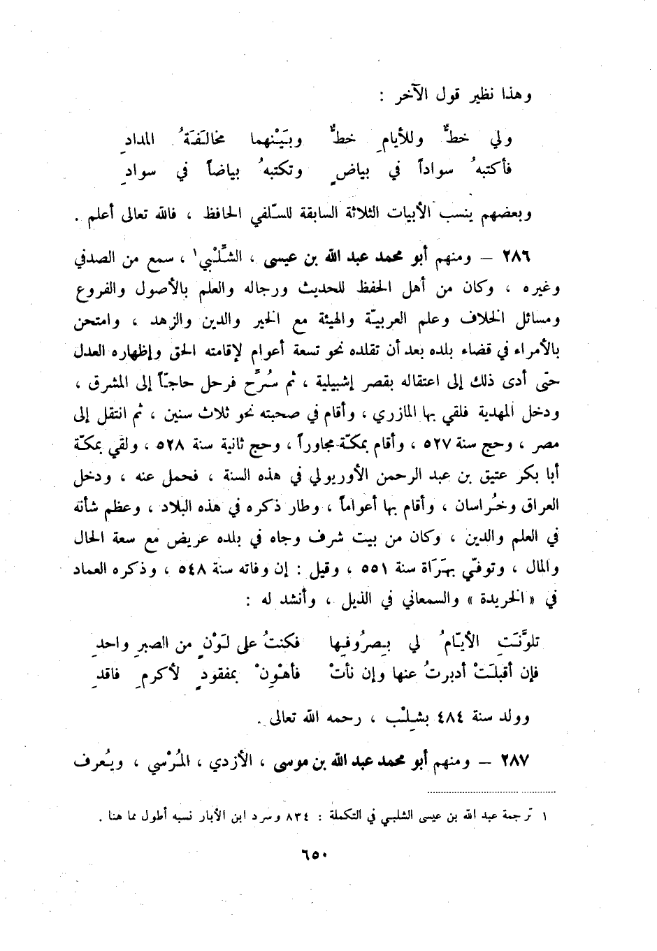 286 - ومنهم أبو محمد عبد الله بن عيسى، الشّلبي (1) ، سمع من الصدفي وغيره، وكان من أهل الحفظ للحديث ورجاله والعلم بالأصول والفروع ومسائل الخلاف وعلم العربيّة والهيئة مع الخير والدين والزهد، وامتحن بالأمراء في قضاء بلده بعد أن تقلده نحو تسعة أعوام لإقامته الحق وإظهاره العدل حتى أدى ذلك إلى اعتقاله بقصر إشبيلية، ثم سرّح فرحل حاجّاً إلى المشرق، ودخل المهدية فلقي بها المازري، وأقام في صحبته نحو ثلاث سنين، ثم انتقل إلى مصر، وحج سنة 527، وأقام بمكّة مجاوراً، وحج ثانية سنة 528، ولقي بمكّة أبا بكر عتيق بن عبد الرحمن الأوريولي في هذه السنة، فحمل عنه، ودخل العراق وخراسان، وأقام بها أعواماً، وطار ذكره في هذه البلاد، وعظم شأنه في العلم والدين، وكان من بيت شرف وجاه في بلده عريض مع سعة الحال والمال، وتوفّي بهراة سنة 551، وقيل: إن وفاته سنة 548، وذكره العماد في الخريدة والسمعاني في الذيل، وأنشد له: