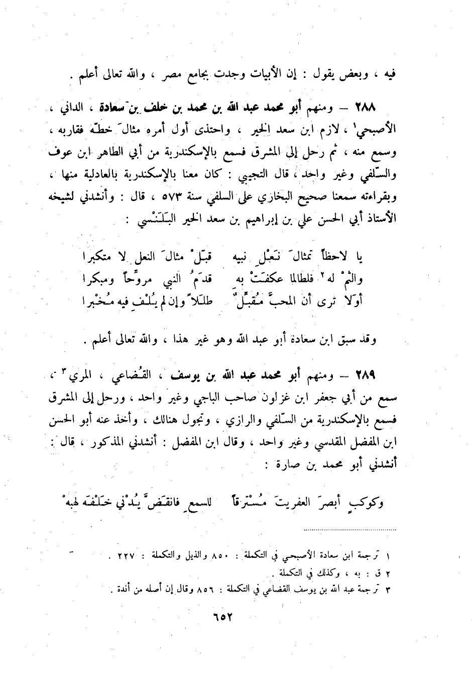 288 - ومنهم أبو محمد عبد الله بن محمد بن خلف بن سعادة، الداني، الأصبحي (1) ، لازم ابن سعد الخير، واحتذى أول أمره مثال خطّه فقاربه، وسمع منه، ثم رحل إلى المشرق فسمع بالإسكندرية من أبي الطاهر ابن عوف والسّلفي وغير واحد، قال التجيبي: كان معنا بالإسكندرية بالعادلية منها، وبقراءته سمعنا صحيح البخاري على السلفي سنة 573، قال: وأنشدني لشيخه الأستاذ أبي الحسن علي ابن إبراهيم بن سعد الخير البلنسي: