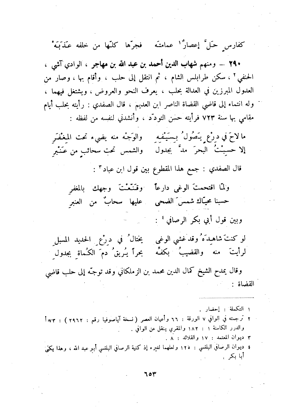كفارسٍ حلّ إعصارٌ (1) عمامته ... فجرّها كلّها من خلفه عذبه 290 - ومنهم شهاب الدين أحمد بن عبد الله بن مهاجر، الوادي آشي، الحنفي (2) ، سكن طرابلس الشام، ثم انتقل إلى حلب، وأقام بها، وصار من العدول المبرزين في العدالة بحلب، ويعرف النحو والعروض، ويشتغل فيهما، وله انتماء إلى قاضي القضاة الناصر ابن العديم، قال الصفدي: رأيته بحلب أيام مقامي بها سنة 723 فرأيته حسن التودّد، وأنشدني لنفسه من لفظه: