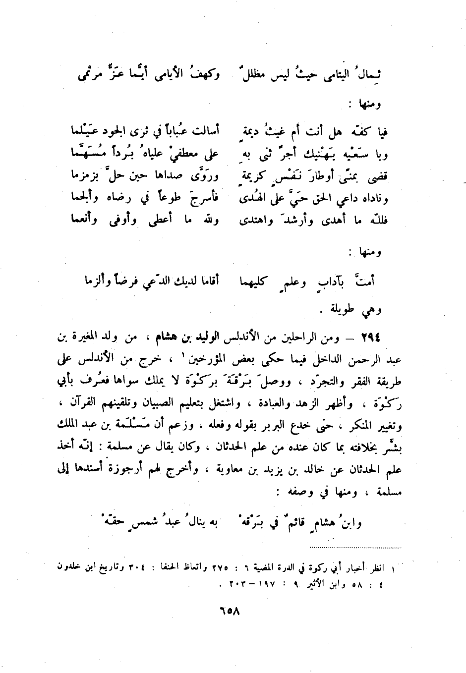 294 - ومن الراحلين من الأندلس الوليد بن هشام، من ولد المغيرة بن عبد الرحمن الداخل فيما حكى بعض المؤرخين (1) ، خرج من الأندلس على طريقة الفقر والتجرّد، ووصل برقة بركوة لا يملك سواها فعرف بأبي ركوة، وأظهر الزهد والعبادة، واشتغل بتعليم الصبيان وتلقينهم القرآن، وتغيير المنكر، حتى خدع البربر بقوله وفعله، وزعم أن مسلمة بن عبد الملك بشّر بخلافته بما كان عنده من علم الحدثان، وكان يقال عن مسلمة: إنّه أخذ علم الحدثان عن خالد بن يزيد بن معاوية، وأخرج لهم أرجوزة أسنده إلى مسلمة، ومنها في وصفه: