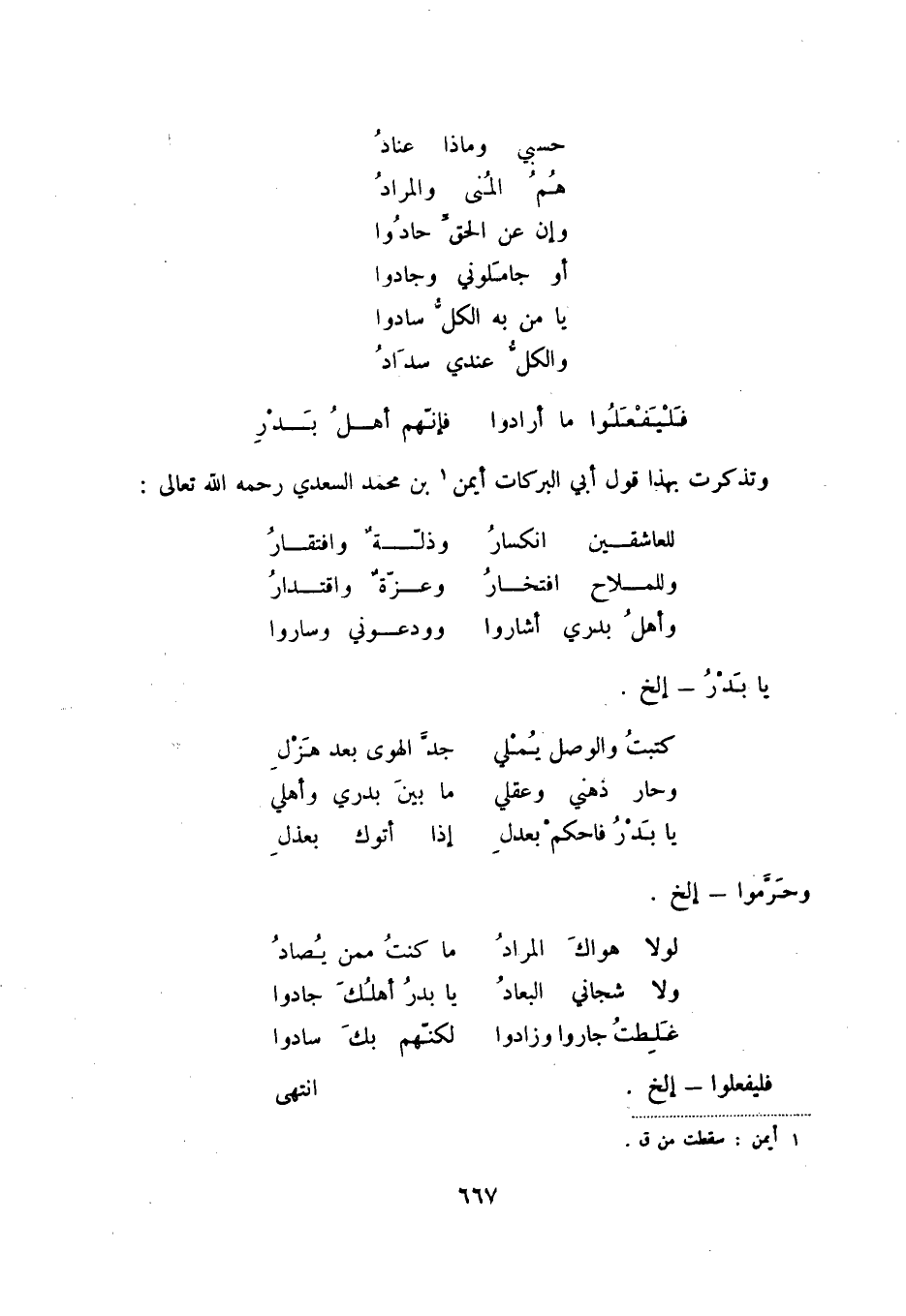 وتذكرت بهذا قول أبي البركات أيمن (1) بن محمد السعدي رحمه الله تعالى: