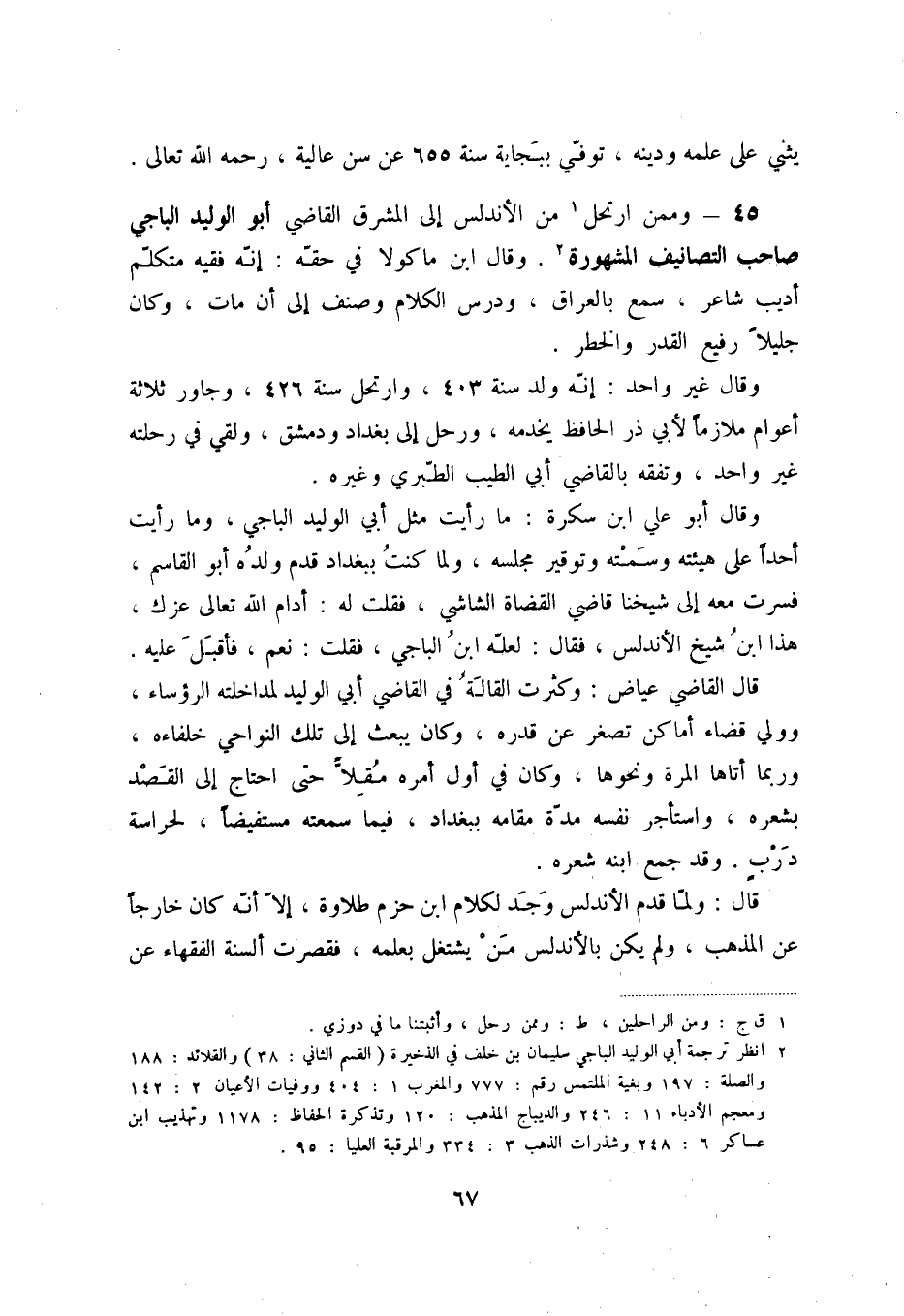 45 - وممن ارتحل (1) من الأندلس إلى المشرق القاضي أبو الوليد الباجي صاحب التصانيف المشهورة (2) . وقال ابن ماكولا في حقّه: إنّه فقيه متكلّم أديب شاعر، سمع بالعراق، ودرس الكلام وصنف إلى أن مات، وكان جليلاً رفيع القدر والخطر.