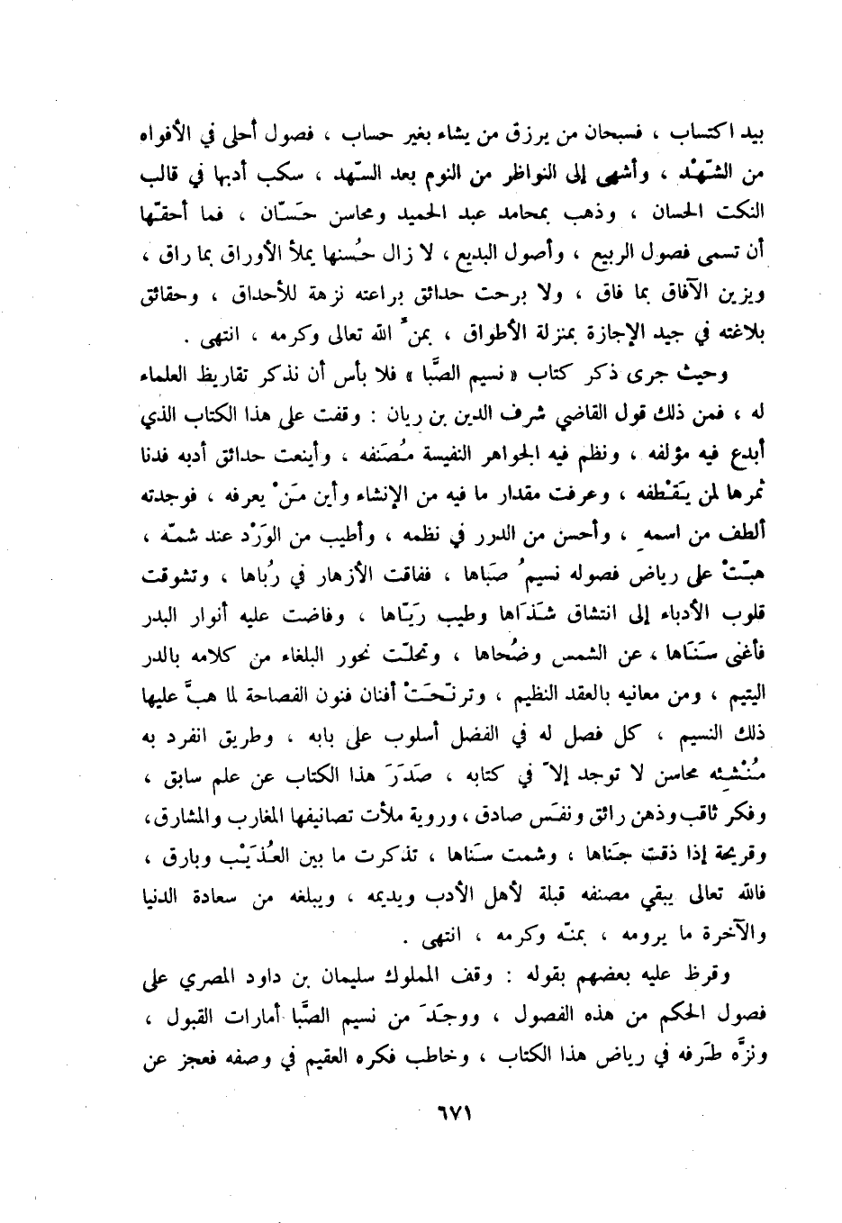 وحيث جرى ذكر كتاب نسيم الصّبا فلا بأس بأن نذكر تقاريظ العلماء له، فمن ذلك قول القاضي شرف الدين بن ريان: وقفت على هذا الكتاب الذي أبد ع فيه مؤلفه، ونظم فيه الجواهر النفيسة مصنفه، وأينعت حدائق أدبه فدنا ثمرها لمن يقطفه، وعرفت مقدار ما فيه من الإنشاء وأين من يعرفه، فوجدته ألطف من اسمه، وأحسن من الدرر في نظمه، وأطيب من الورد عند شمّه، هبّت على رياض فصوله نسيم صباها، ففاقت الأزهار في رباها، وتشوقت قلوب الأدباء إلى انتشاق شذاها وطيب ريّاها، وفاضت عليه أنوار البدر فأغنى سناها، عن الشمس وضحاها، وتحلّت نحور البلغاء من كلامه بالدر اليتيم، ومن معانيه بالعقد النظيم، وترنّحت أفنان فنون الفصاحة لما هبّ عليها ذلك النسيم، كل فصل له في الفضل أسلوب على بابه، وطريق انفرد به منشئه محاسن لا توجد إلاّ في كتابه، صدر هذا الكتاب عن علم سابق وفكر ثاقب وذهن رائق ونفس صادق، وروية ملأت تصانيفها المغارب والمشارق، وقريحة إذا ذقت جناها، وشمت سناها، تذكرت ما بين العذيب وبارق، فالله تعالى يبقي مصنفه قبلة لأهل الأدب ويديمه، ويبلغه من سعادة الدنيا والآخرة ما يرومه، بمنّه وكرمه، انتهى.
