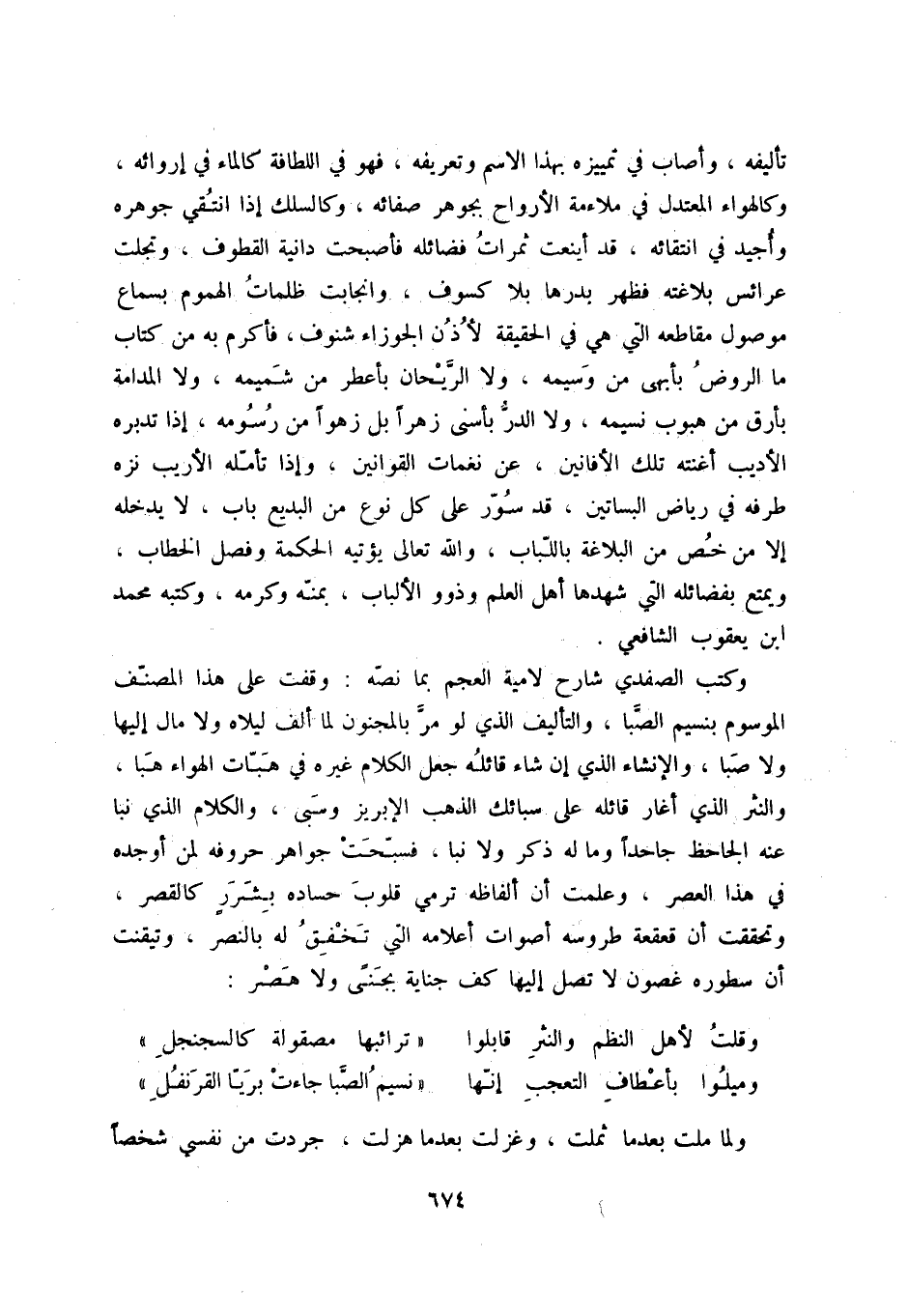 وكتب الصفدي شارح لامية العجم بما نصّه: وقفت على هذا المصنّف الموسوم بنسيم الصّبا، والتأليف الذي لو مرّ بالمجنون لم ألف ليلاه ولا مال إليها ولا صبا، والإنشاء الذي إن شاء قائله جعل الكلام غيره في هبّات الهواء هبا، والنثر الذي أغار قائله على سبائك الذهب الإبريز وسبى، والكلام الذي نبا عنه الجاحظ جاحداً وما له ذكر ولا نبا، فسبّحت جواهره حروفه لمن أوجده في هذا العصر، وعلمت أن ألفاظه ترمي قلوب حساده بشررٍ كالقصر، وتحققت أن قعقعة طروسه أصوات أعلامه التي تخفق له بالنصر، وتيقنت أن سطوره غصون لا تصل إليها كف جناية بجنىً ولا هصر: