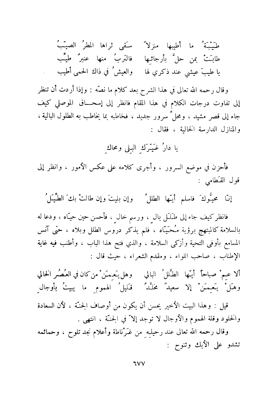 وقال رحمه الله تعالى في هذا الشرح بعد كلام ما نصّه: وإذا أردت أن تنظر إلى تفاوت درجات الكلام في هذا المقام فانظر إلى إسحاق الموصلي كيف جاء إلى قصر مشيد، ومحلّ سرور جديد، فخاطبه بما يخاطب به الطلول البالية، والمنازل الدارسة الخالية، فقال: