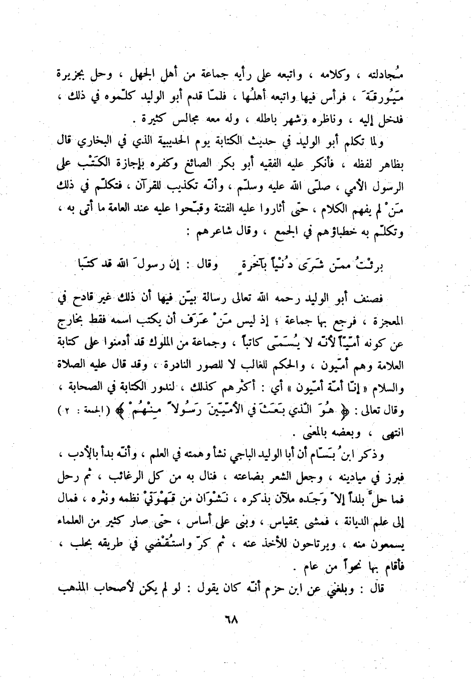 ولما تكلم أبو الوليد في حديث الكتابة يوم الحديبية الذي في البخاري قال بظاهر لفظه، فأنكر عليه الفقيه أبو بكر الصائغ وكفره بإجازة الكتب على الرسول الأمي، صلّى الله عليه وسلّم، وأنّه تكذيب للقرآن، فتكلّم في ذلك من لم يفهم الكلام، حتى أثاروا عليه الفتنة وقبّحوا عليه عند العامة ما أتى به، وتكلّم به خطباؤهم في الجمع، وقال شاعرهم:
