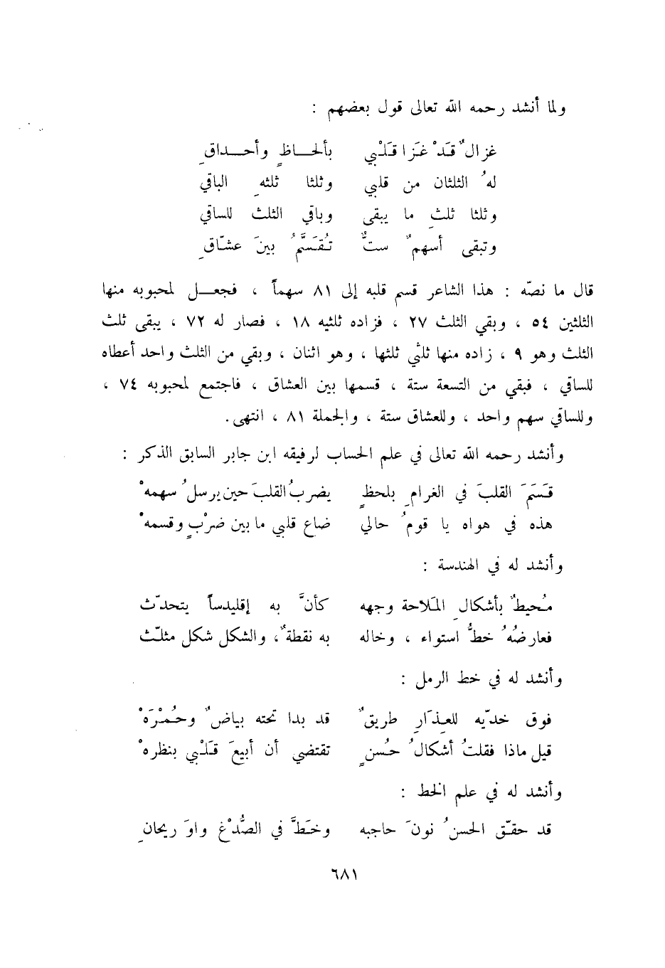 قال ما نصّه: هذا الشاعر قسم قلبه إلى 81 سهماً، فجعل لمحبوبه منها الثلثين 54، وبقي الثلث 27، فزاده ثلثيه 18، فصار له 72، يبقى ثلث الثلث وهو 9، زاده منها ثلثي الثلث، وهو اثنان، وبقي من الثلث واحد أعطاه للساقي، فبقي من التسعة ستة، قسمها بين العشاق، فاجتمع لمحبوبه 74، وللساقي سهم واحد، وللعشاق ستة، والجملة 81، انتهى.