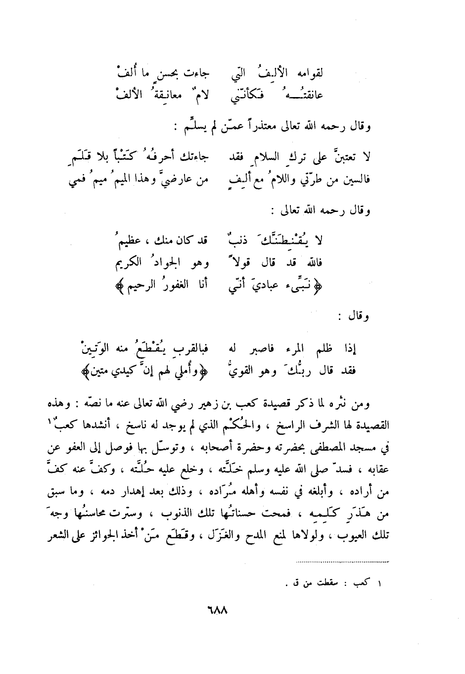 ومن نثره لما ذكر قصيدة كعب بن زهير رضي الله تعالى عنه ما نصّه: وهذه القصيدة لها الشرف الراسخ، والحكم الذي لم يوجد له ناسخ، أنشدها كعبٌ (1) في مسجد المصطفى بحضرته وحضرة أصحابه، وتوسّل بها فوصل إلى العفو عن عقابه، فسدّ صلى الله عليه وسلم خلّته، وخلع عليه حلّته، وكفّ عنه كفّ من أراده، وأبلغه في نفسه وأهله مراده، وذلك بعد إهدار دمه، وما سبق من هذر كلمه، فمحت حسناتها تلك الذنوب، وسترت محاسنها وجه تلك العيوب، ولولاها لمنع المدح والغزل، وقطع من أخذ الجوائز على الشعر