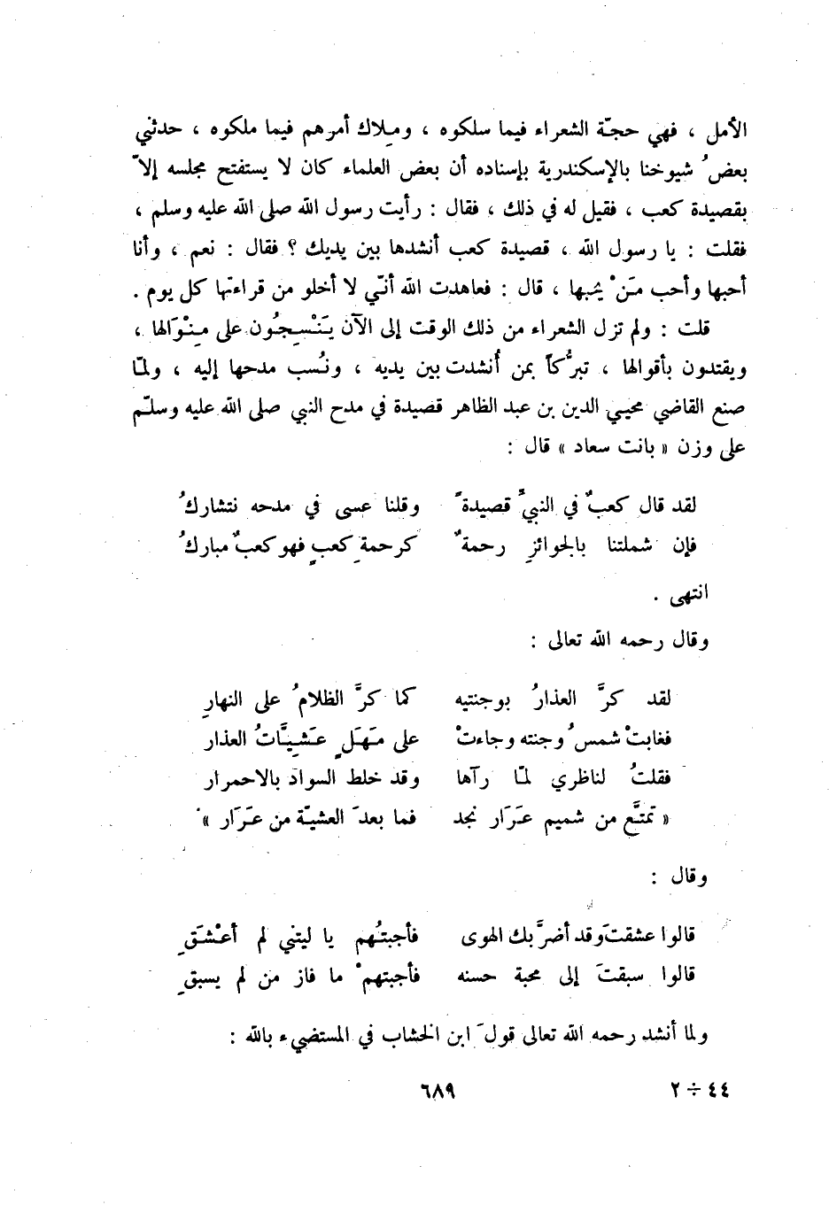 الأمل، فهي حجّة الشعراء فيما سلكوه، وملاك أمرهم فيما ملكوه، حدثني بعض شيوخنا بالإسكندرية بإسناديه أبن بعض العلماء كان لا يستفتح مجلسه إلا بقصيدة كعب، فقيل له في ذلك، فقال: رأيت رسول الله صلى الله عليه وسلم، فقلت: يا رسول الله، قصيدة كعب أنشدها بين يديك فقال: " نعم، وأنا أحبها وأحب من يحبها "، قال: فعاهدت الله أنّي لا أخلو من قراءتها كل يوم.