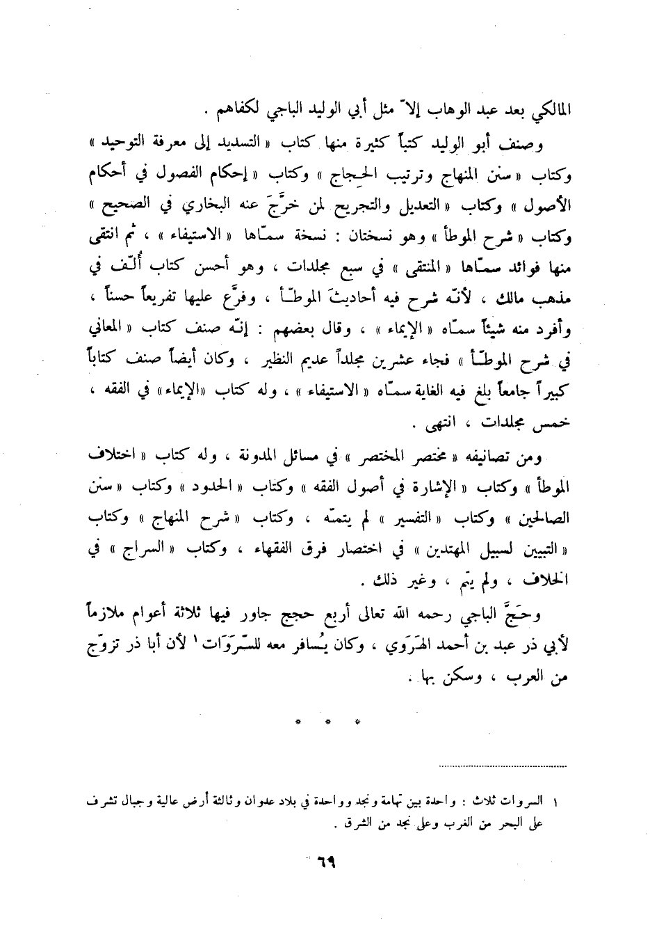 وصنف أبو الوليد كتباً كثيرة منها كتاب التسديد إلى معرفة التوحيد وكتاب سنن المنهاج وترتيب الحجاج وكتاب إحكام الفصول في أحكام الأصول وكتاب التعديل والتجريح لمن خرّج عنه البخاري في الصحيح وكتاب شرح الموطأ وهو نسختان: نسخة سمّاها الاستيفاء، ثم انتقى منها فوائد سمّاها المنتقى في سبع مجلدات، وهو أحسن كتاب ألّف في مذهب مالك، لأنّه شرح في أحاديث الموطّأ، وفرّع عليها تفريعاً حسناً، وأفرد منه شيئاً سمّاه الإيماء، وقال بعضهم: إنّه صنف كتاب المعاني في شرح الموطّأ فجاء عشرين مجلداً عديم النظير، وكان أيضاً صنف كتاباً كبيراً جامعاً يلغ فيه الغاية سمّاه الاستيفاء، وله كتابا لإيماء في الفقه، خمس مجلدات، انتهى.