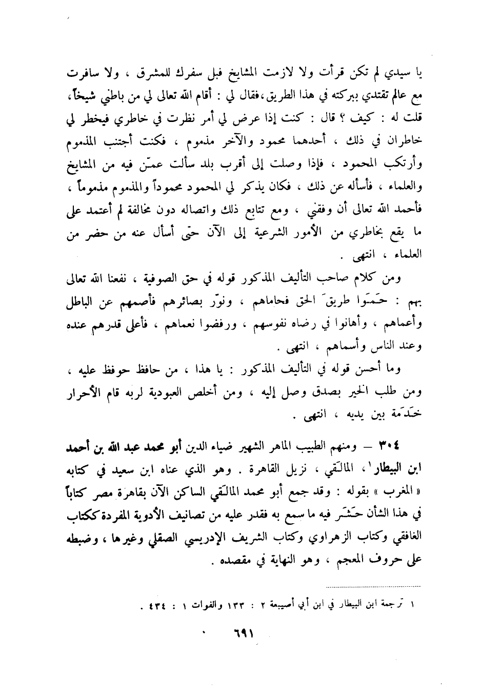 304 - ومنهم الطبيب الماهر الشهير ضياء الدين أبو محمد عبد الله بن أحمد ابن البيطار (1) ، المالقي، نزيل القاهرة، وهو الذي عناه ابن سعيد في كتابه المغرب بقوله: وقد جمع أبو محمد المالقي الساكن الآن بقاهرة مصر كتاباً في هذا الشأن حشر فيه ما سمع به فقدر عليه من تصانيف الأدوية المفردة ككتاب الغافقي وكتاب الزهراوي وكتاب الشريف الإدريسي الصقلي وغيرها، وضبطه على جروف المعجم، وهو النهاية في مقصده.