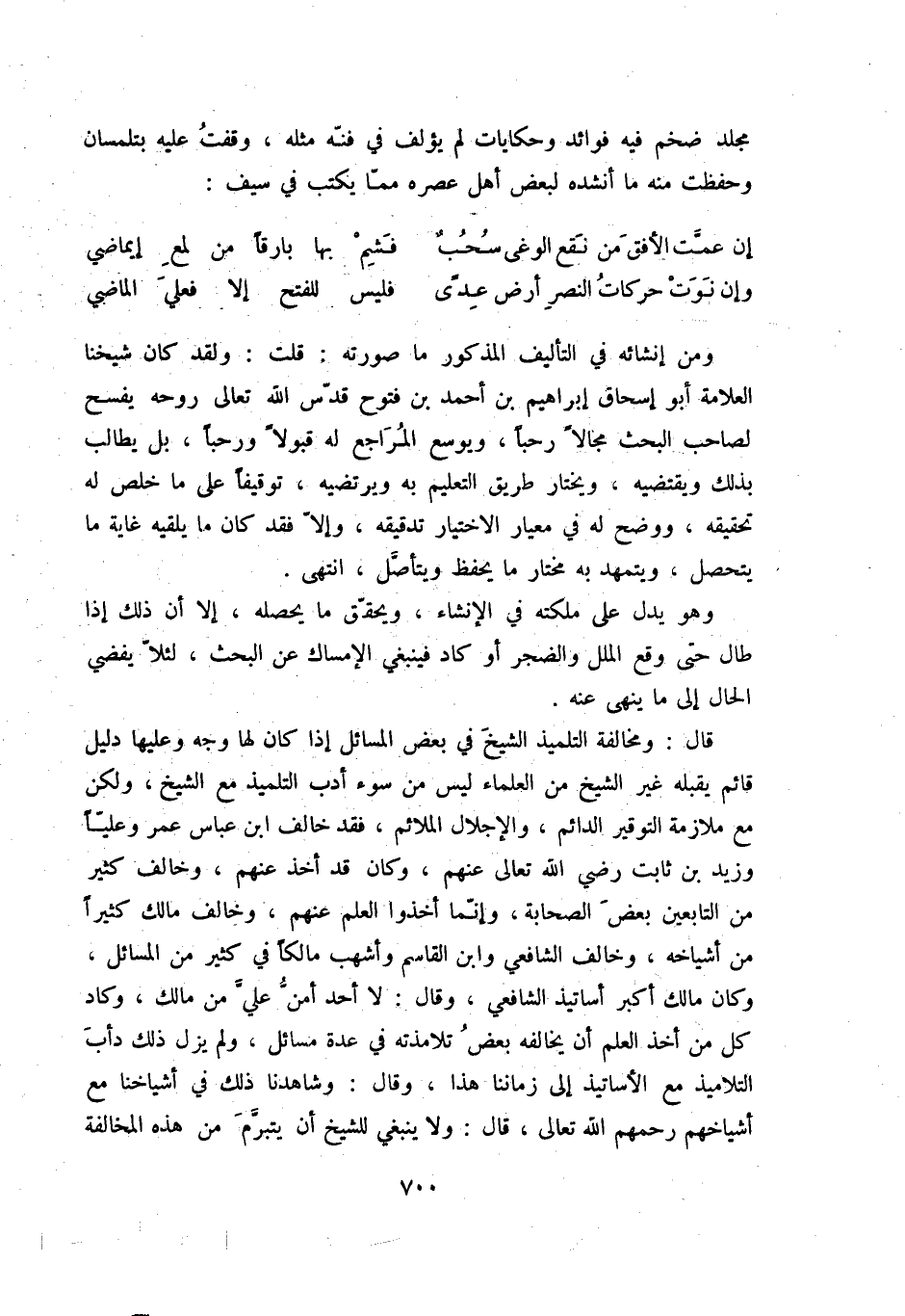 قال: ومخالفة التلميذ الشيخ في بعض المسائل إذا كان لها وجه وعليها دليل قائم يقبله غير الشيخ من العلماء ليس من سوء أدب التلميذ مع الشيخ، ولكن مع ملازمة التوقير الدائم، والإجلال الملائم، فقد خالف ابن عباس عمر وعليّاً وزيد بن ثابت رضي الله تعالى عنهم، وكان قد أخذ عنهم، وخالف كثير من التابعين بعض الصحابة، وإنّما أخذوا العلم عنهم، وخالف مالك كثيراً من أشياخه، وخالف الشافعي وأشهب مالكاُ في كثير من المسائل، كل من أخذ العلم أن يخالفه بعض تلامذته في عدة مسائل، ولم يزل ذلك دأب التلاميذ مع الأساتيذ إلى زماننا هذا، وقال: وشاهدنا ذلك في أشياخنا مع أشياخهم رحمهم الله تعالى، قال: ولا ينبغي للشيخ أن يتبرّم من هذه المخالفة