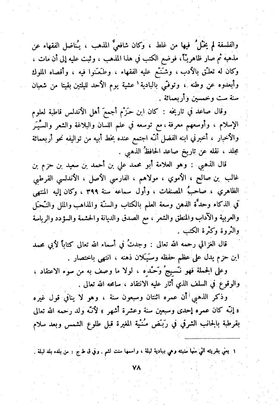 والفلسفة لم يخل فيها من غلط، وكان شافعيّ المذهب، يناضل الفقهاء عن مذهبه ثم صار ظاهريّاً، فوضع الكتب في هذا المذهب، وثبت عليه إلى أن مات، وكان له تعلّق بالأدب، وشنّع عليه الفقهاء، وطعنوا فيه، وأقصاه الملوك وأبعدوه عن وطنه، وتوفّي بالبادية (1) عشية يوم الأحد لليلتين بقيتا من شعبان سنة ست وخمسين وأربعمائة.