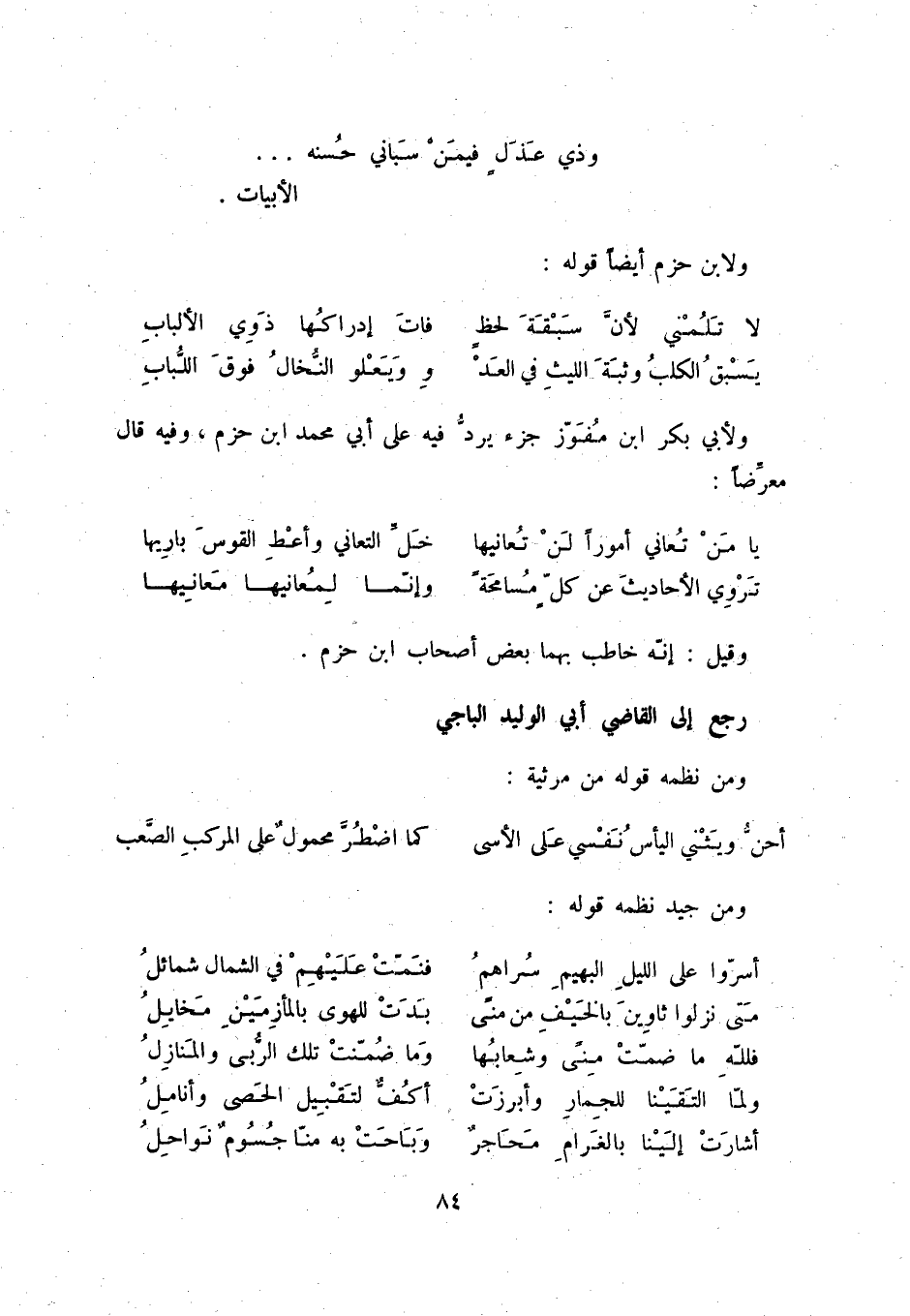 يسبق الكلب وثبة الليث في العد ... وويعلو النّخال في اللّباب ولأبي بكر ابن مفوّز جزء يردّ فيه على أبي محمد ابن حزم، وفيه قال معرّضاً: