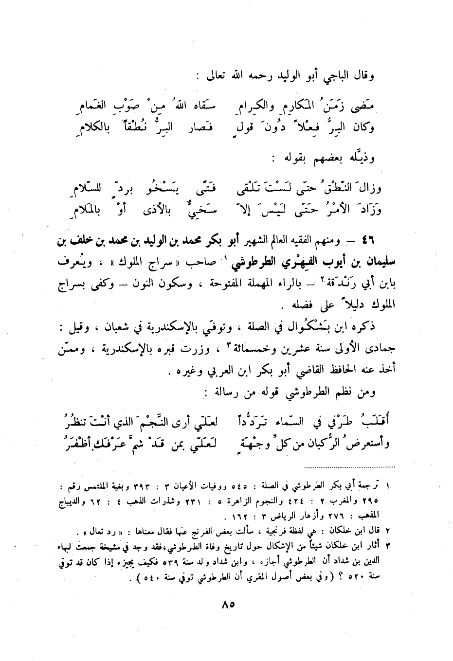 وزاد الأمر حتّى ليس إلاّ ... سخيٌّ بالأذى أو بالملام 46 - ومنهم الفقيه العالم الشهير أبو بكر محمد بن الوليد بن محمد بن خلف بن سليمان بن أيوب الفهري الطرطوشي (1) صاحب سراج الملوك، ويعرف بابن أبي رندقة (2) - بالراء المهملة المفتوحة، وسكون النون - وكفى بسراج الملوك دليلاً على فضله.