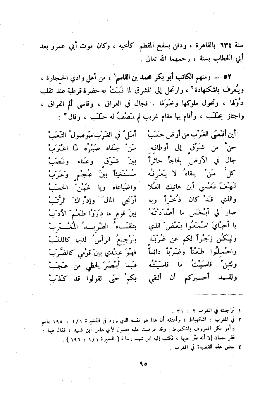 52 - ومنهم الكاتب أبو بكر محمد بن القاسم (1) ، من أهل وادي الحجارة، ويعرف باشكنهادة (2) ، وارتحل إلى المشرق لما نبت به حضرة قرطبة عند تقلب دولها، وتحول ملوكها وخولها، فجال في العراق، وقاسى ألم الفراق، واجتاز بحلب، وأقام بها مقام غريب لم يصف له حلب، وقال (3) :