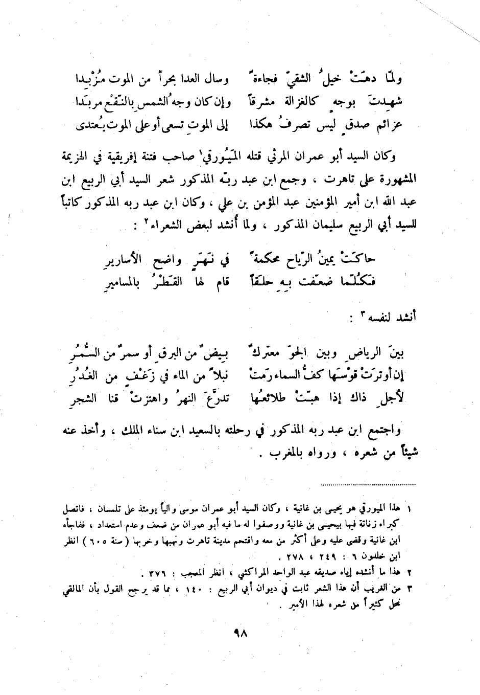 عزائم صدقٍ ليس تصرف هكذا ... إلى الموت تسعى أو على الموت يعتدى وكان السيد أبو عمران المرثي قتله الميورقي (1) صاحب فتنة إفريقية في الهزيمة المشهورة على تاهرت، وجمع ابن عبد ربّه المذكور شعر السيد أبي الربيع ابن عبد الله ابن أمير المؤمنين عبد المؤمن بن علي، وكان ابن عبد ربه المذكور كاتباً للسيد أبي الربيع سليمان المذكور، ولما أنشد لبعض الشعراء (2) :