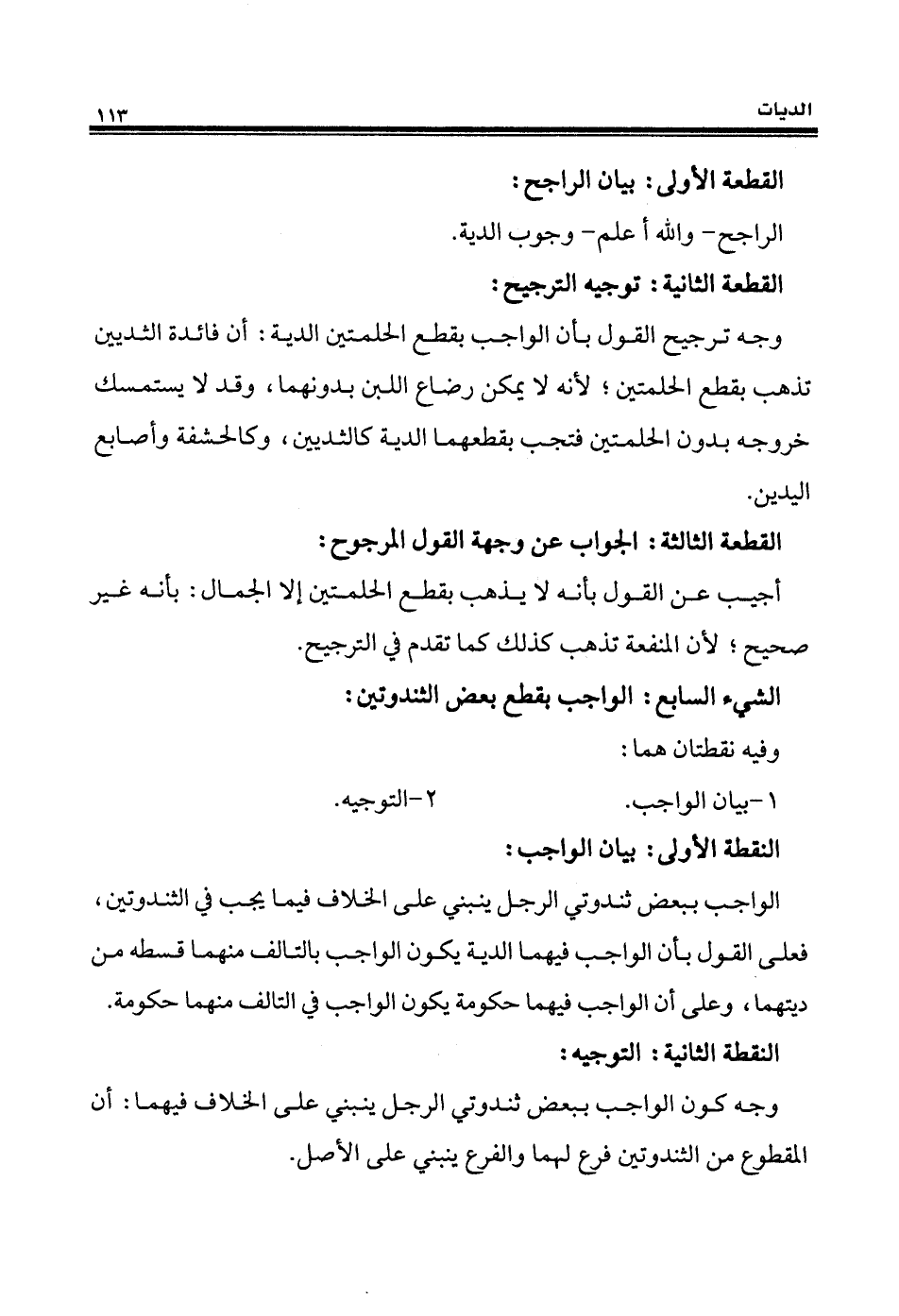 وجه ترجيح القول بأن الواجب بقطع الحلمتين الدية: أن فائدة الثديين تذهب بقطع الحلمتين؛ لأنه لا يمكن رضاع اللبن بدونهما، وقد لا يستمسك خروجه بدون الحلمتين فتجب بقطعهما الدية كالثديين، وكالحشفة وأصابع اليدين.