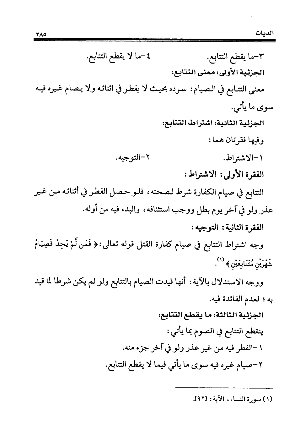 وجه اشتراط التتابع في صيام كفارة القتل قوله تعالى: {فَمَنْ لَمْ يَجِدْ فَصِيَامُ شَهْرَيْنِ مُتَتَابِعَيْنِ} (¬1).