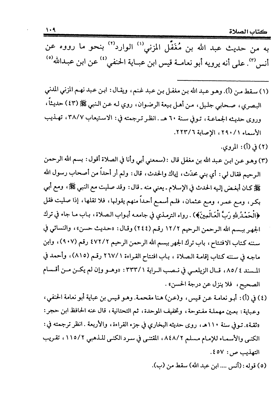 (¬3) وهو عن ابن عبد الله بن مغفل قال: (سمعني أبي وأنا في الصلاة أقول: بسم الله الرحمن الرحيم فقال لي: أي بني محدَث، إياك والحدث، قال: ولم أر أحداً من أصحاب رسول الله - صلى الله عليه وسلم - كان أبغض إليه الحدث في الإِسلام - يعني منه - قال: وقد صليت مع النبي - صلى الله عليه وسلم -، ومع أبي بكر، ومع عمر، ومع عثمان، فلم أسمع أحداً منهم يقولها، فلا تقلها، إذا صليت فقل {الْحَمْدُ لِلَّهِ رَبِّ الْعَالَمِينَ}. رواه الترمذي في جامعه أبواب الصلاة، باب ما جاء في ترك الجهر ببسم الله الرحمن الرحيم 2/ 12 رقم (244) وقال: "حديث حسن"، والنسائي في سننه كتاب الافتتاح، باب ترك الجهر ببسم الله الرحمن الرحيم 2/ 472 رقم (907)، وابن ماجه في سننه كتاب إقامة الصلاة، باب افتتاح القراءة 1/ 267 رقم (815)، وأحمد في المسند 4/ 85، قال الزيلعي في نصب الراية 1/ 333: "وهو وإن لم يكن من أقسام الصحيح، فلا ينزل عن درجة الحسن".