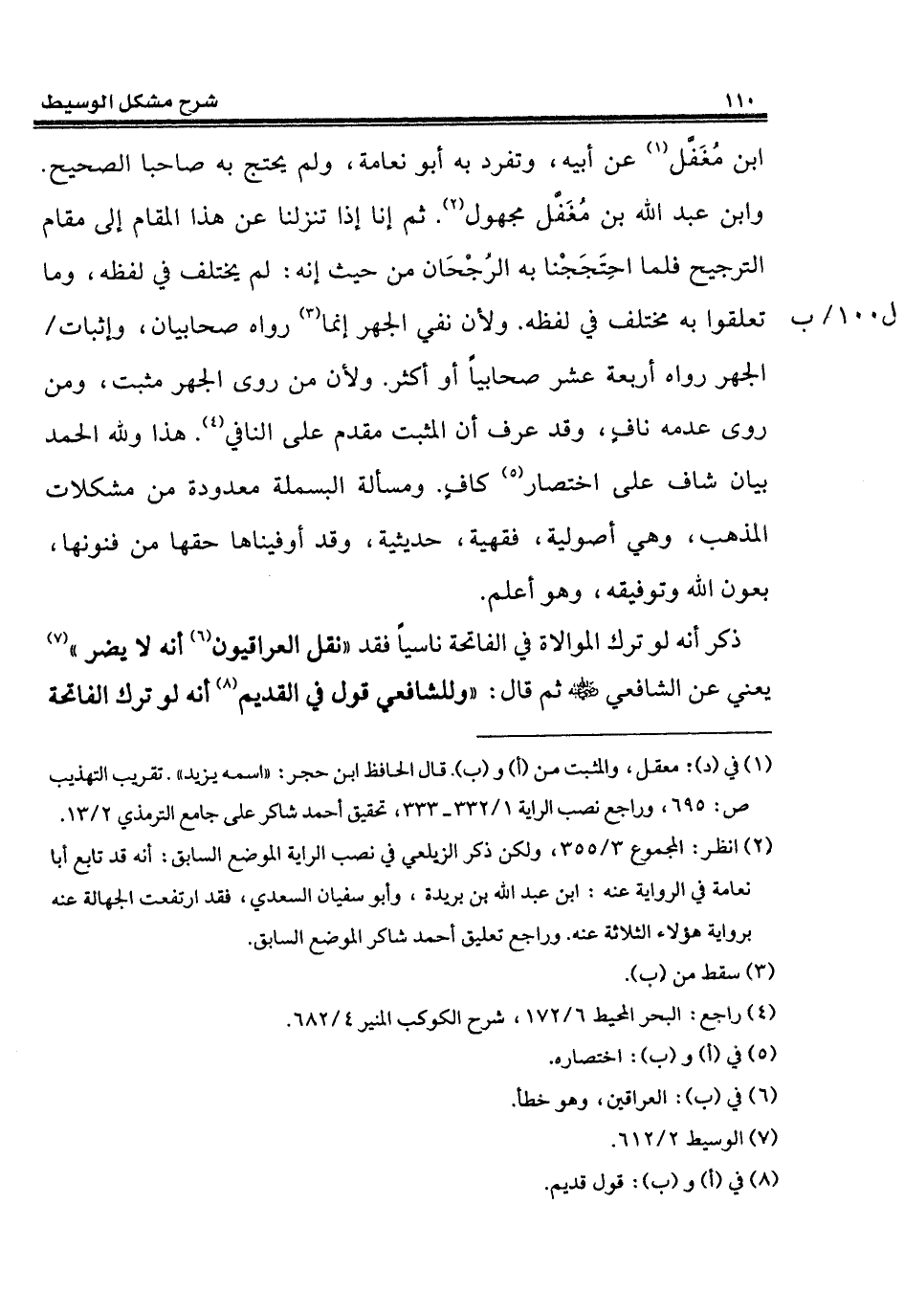 ابن مُغَفَّل (¬1) عن أبيه، وتفرد به أبو نعامة، ولم يحتج به صاحبا الصحيح. وابن عبد الله بن مُغَفَّل مجهول (¬2). ثم إنا إذا تنزلنا عن هذا المقام إلى مقام الترجيح فلما احِتَجَجْنا به الرُجْحَان من حيث إنه: لم يختلف في لفظه، وما تعلقوا به يختلف في لفظه. ولأن نفي الجهر إنما (¬3) رواه صحابيان، وإثبات الجهر رواه أربعة عشر صحابياً أو أكثر. ولأن من روى الجهر مثبت، ومن روى عدمه نافٍ، وقد عرف أن المثبت مقدم على النافي (¬4). هذا ولله الحمد بيان شاف على اختصار (¬5) كافٍ. ومسألة البسملة معدودة من مشكلات المذهب، وهي أصولية، فقهية، حديثية، وقد أوفيناها حقها من فنونها، بعون الله وتوفيقه، وهو أعلم.