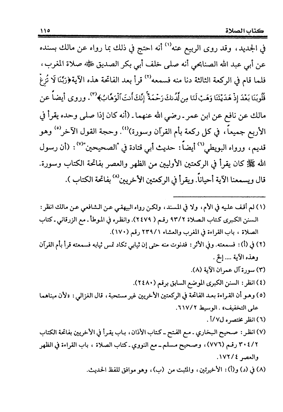 في الجديد، وقد روى الربيع عنه (¬1) أنه احتج في ذلك بما رواه عن مالك بسنده عن أبي عبد الله الصنابحي أنه صلى خلف أبي بكر الصديق - رضي الله عنه - صلاة المغرب، فلما قام في الركعة الثالثة دنا منه فسمعه (¬2) قرأ بعد الفاتحة هذه الآية {رَبَّنَا لَا تُزِغْ قُلُوبَنَا بَعْدَ إِذْ هَدَيْتَنَا وَهَبْ لَنَا مِنْ لَدُنْكَ رَحْمَةً إِنَّكَ أَنْتَ الْوَهَّابُ} (¬3). وروى أيضاً عن مالك عن نافع عن ابن عمر - رضي الله عنهما - (أنه كان إذا صلى وحده يقرأ في الأربع جميعاً، في كل ركعة بأم القرآن وسورة) (¬4). وحجة القول الآخر (¬5) وهو قديم، ورواه البويطي (¬6) أيضاً: حديث أبي قتادة في "الصحيحين" (¬7): (أن رسول الله - صلى الله عليه وسلم - كان يقرأ في الركعتين الأوليين من الظهر والعصر بفاتحة الكتاب وسورة. قال ويسمعنا الآية أحياناً. ويقرأ في الركعتين الأخريين (¬8) بفاتحة الكتاب).
