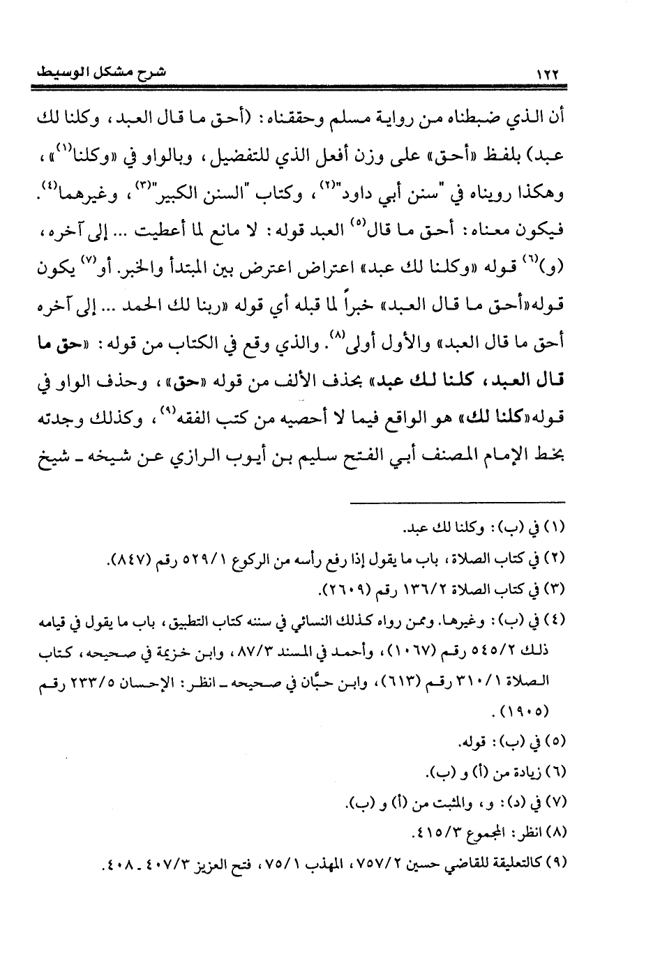 أن الذي ضبطناه من رواية مسلم وحققناه: (أحق ما قال العبد، وكلنا لك عبد) بلفظ "أحق" على وزن أفعل الذي للتفضيل، وبالواو في "وكلنا (¬1) "، وهكذا رويناه في "سنن أبي داود" (¬2)، وكتاب "السنن الكبير" (¬3)، وغيرهما (¬4). فيكون معناه: أحق ما قال (¬5) العبد قوله: لا مانع لما أعطيت ... إلى آخره، (و) (¬6) قوله "وكلنا لك عبد" اعتراض اعترض بين المبتدأ والخبر. أو (¬7) يكون قوله "أحق ما قال العبد" خبراً لما قبله أي قوله "ربنا لك الحمد ... إلى آخره أحق ما قال العبد" والأول أولى (¬8). والذي وقع في الكتاب من قوله: "حق ما قال العبد، كلنا لك عبد" بحذف الألف من قوله "حق"، وحذف الواو في قوله "كلنا لك" هو الواقع فيما لا أحصيه من كتب الفقه (¬9)، وكذلك وجدته بخط الإمام المصنف أبي الفتح سليم بن أيوب الرازي عن شيخه - شيخ
