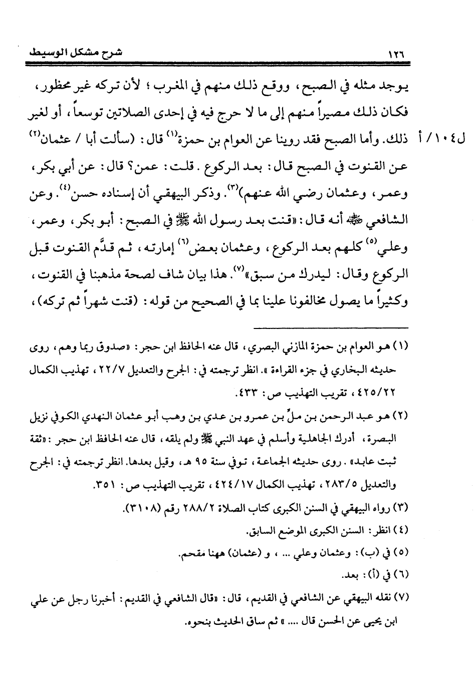 يوجد مثله في الصبح، ووقع ذلك منهم في المغرب؛ لأن تركه غير محظور، فكان ذلك مصيراً منهم إلى ما لا حرج فيه في إحدى الصلاتين توسعاً، أو لغير ذلك. وأما الصبح فقد روينا عن العوام بن حمزة (¬1) قال: (سألت أبا عثمان (¬2) عن القنوت في الصبح قال: بعد الركوع. قلت: عمن؟ قال: عن أبي بكر، وعمر، وعثمان رضي الله عنهم) (¬3). وذكر البيهقي أن إسناده حسن (¬4). وعن الشافعي - رضي الله عنه - أنه قال: "قنت بعد رسول الله - صلى الله عليه وسلم - في الصبح: أبو بكر، وعمر، وعلي (¬5) كلهم بعد الركوع، وعثمان بعض (¬6) إمارته، ثم قدَّم القنوت قبل الركوع وقال: ليدرك من سبق" (¬7). هذا بيان شاف لصحة مذهبنا في القنوت، وكثيراً ما يصول مخالفونا علينا بما في الصحيح من قوله: (قنت شهراً ثم تركه)،