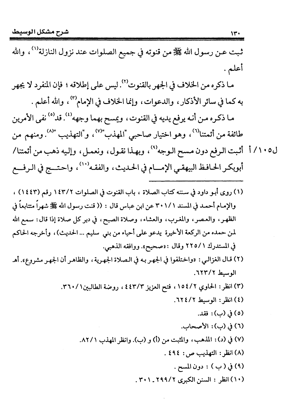 ما ذكره من أنه يرفع يديه في القنوت، ويمسح بهما وجهه (¬4). قد (¬5) نفى الأمرين طائفة من أئمتنا (¬6)، وهو اختيار صاحبي "المهذب" (¬7)، و"التهذيب" (¬8). ومنهم من أثبت الرفع دون مسح الوجه (¬9)، وبهذا نقول، ونعمل، وإليه ذهب من أئمتنا أبو بكر الحافظ البيهقي الإمام في الحديث، والفقه (¬10)، واحتج في الرفع