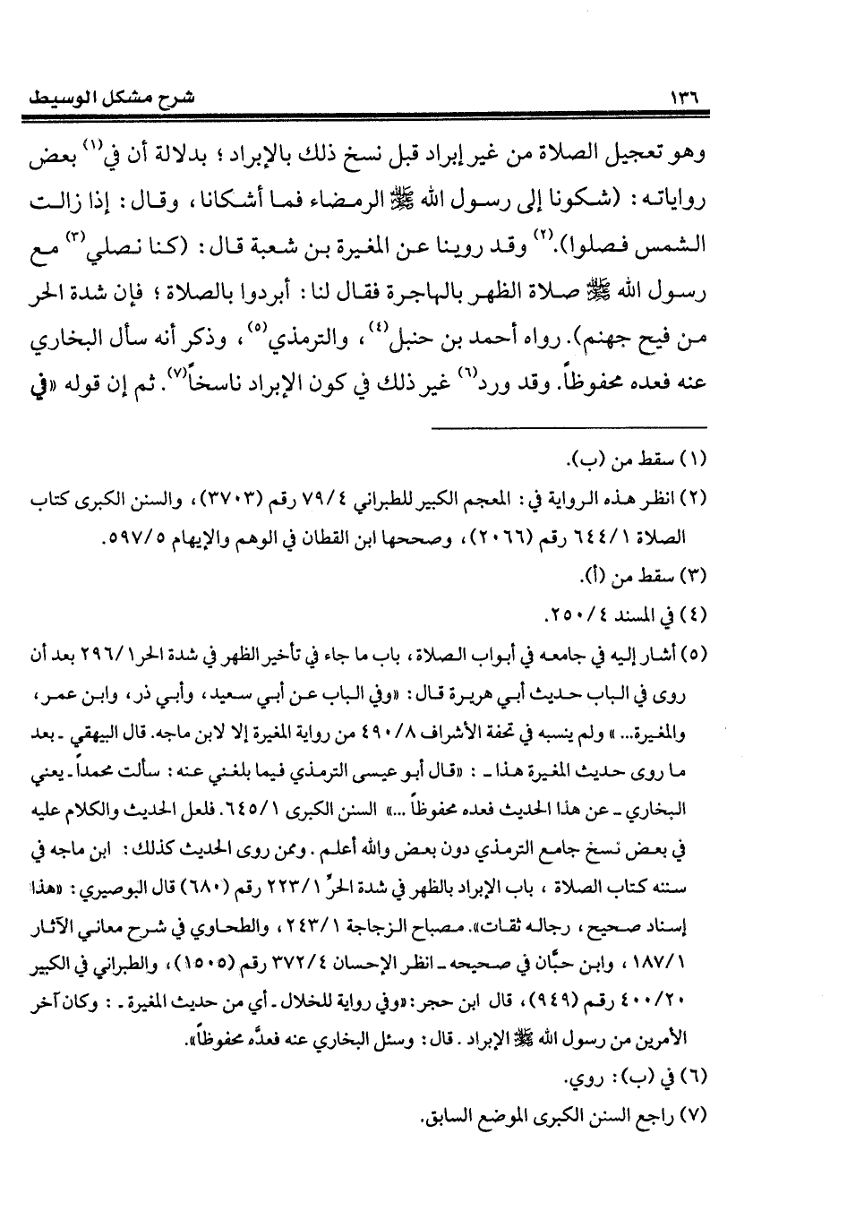(¬5) أشار إليه في جامعه في أبواب الصلاة، باب ما جاء في تأخير الظهر في شدة الحر 1/ 296 بعد أن روى في الباب حديث أبي هريرة قال: "وفي الباب عن أبي سعيد، وأبي ذر، وابن عمر، والمغيرة ... " ولم ينسبه في تحفة الأشراف 8/ 490 من رواية المغيرة إلا لابن ماجه. قال البيهقي - بعد ما روى حديث المغيرة هذا -: "قال أبو عيسى الترمذي فيما بلغني عنه: سألت محمداً - يعني البخاري - عن هذا الحديث فعده محفوظاً ... " السنن الكبرى 1/ 645. فلعل الحديث والكلام عليه في بعض نسخ جامع الترمذي دون بعض والله اعلم. وممن روى الحديث كذلك: ابن ماجه في سننه كتاب الصلاة، باب الإبراد بالظهر في شدة الحرِّ 1/ 223 رقم (680) قال البوصيري: "هذا إسناد صحيح، رجاله ثقات". مصباح الزجاجة 1/ 243، والطحاوي في شرح معاني الآثار 1/ 187، وابن حبَّان في صحيحه - انظر الإحسان 4/ 372 رقم (1505)، والطبراني في الكبير 20/ 400 رقم (949)، قال ابن حجر: "وفي رواية للخلال - أي من حديث المغيرة -: وكان آخر الأمرين من رسول الله - صلى الله عليه وسلم - الإبراد. قال: وسئل البخاري عنه فعدَّه محفوظاً".