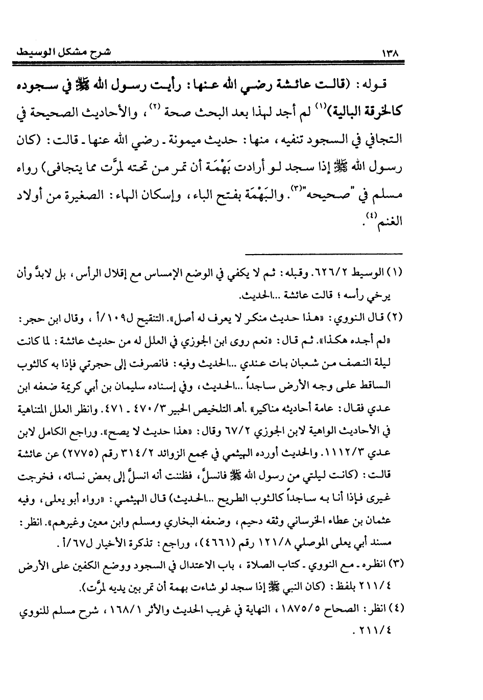 (¬1) الوسيط 2/ 626. وقبله: ثم لا يكفي في الوضع الإمساس مع إقلال الرأس، بل لا بدَّ وأن يرخي رأسه؛ قالت عائشة ... الحديث.